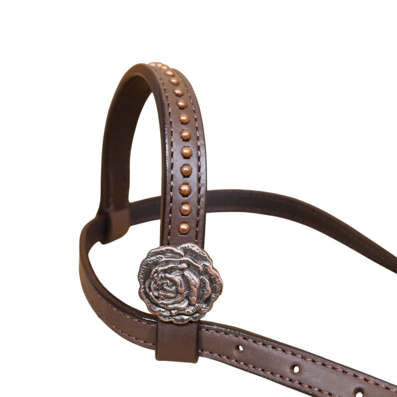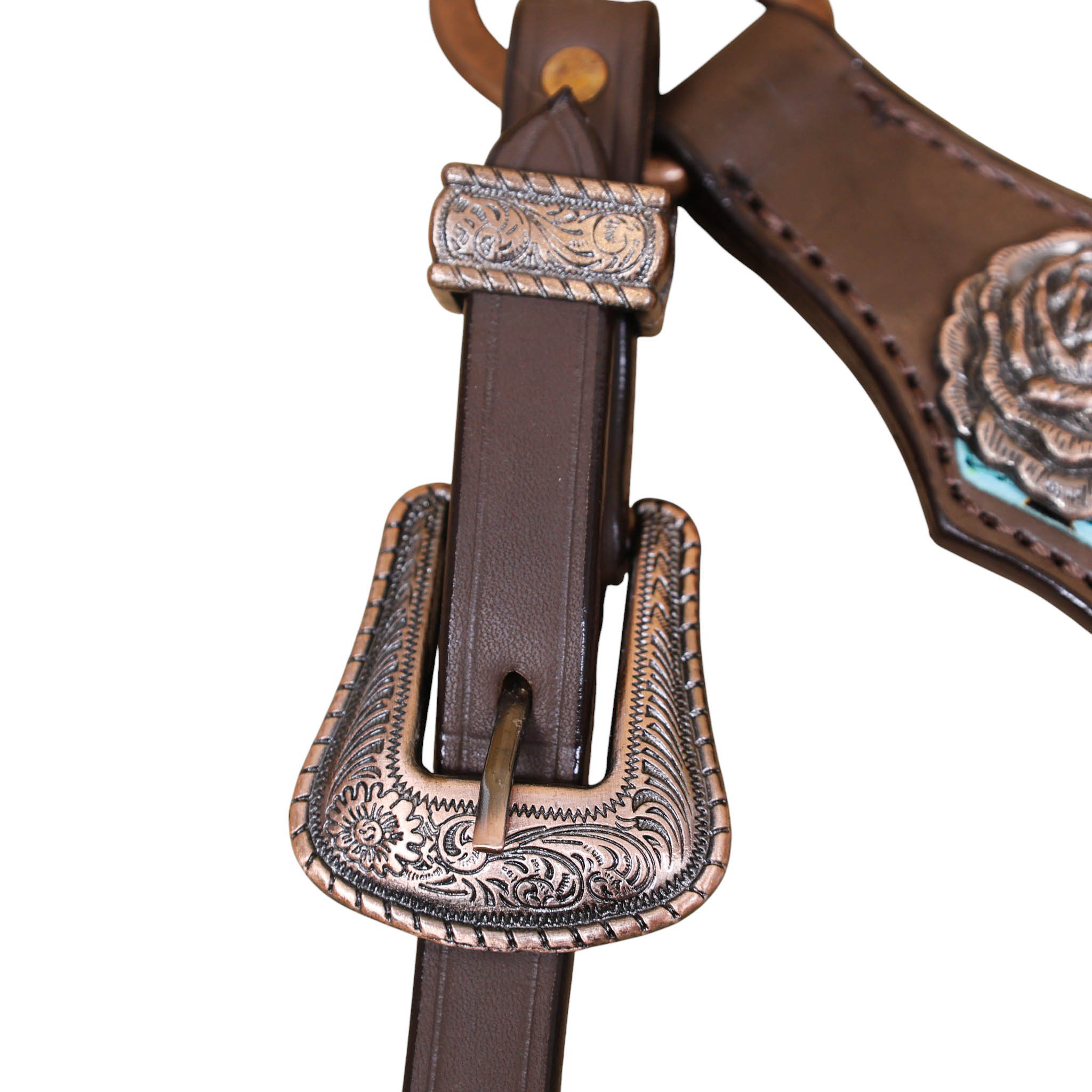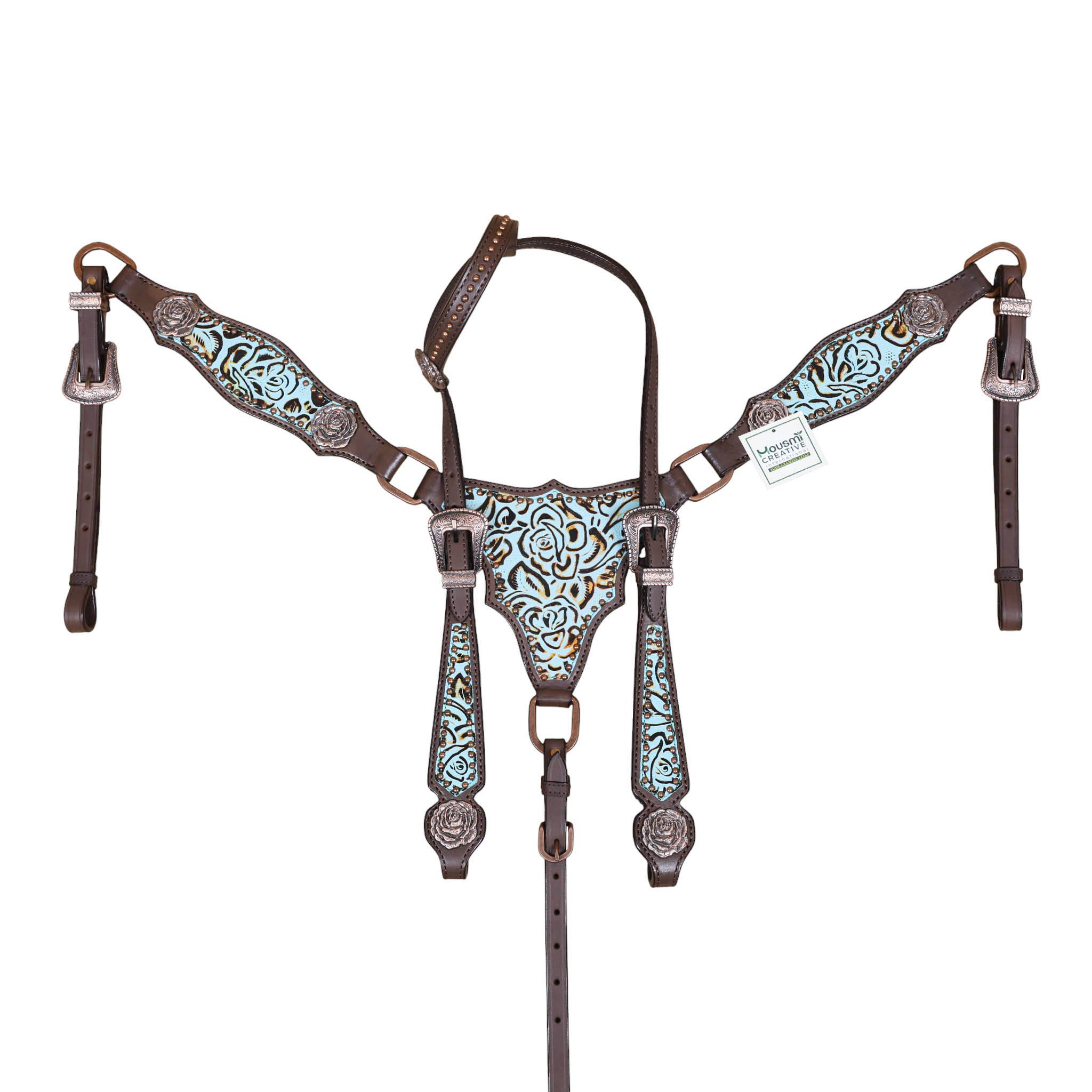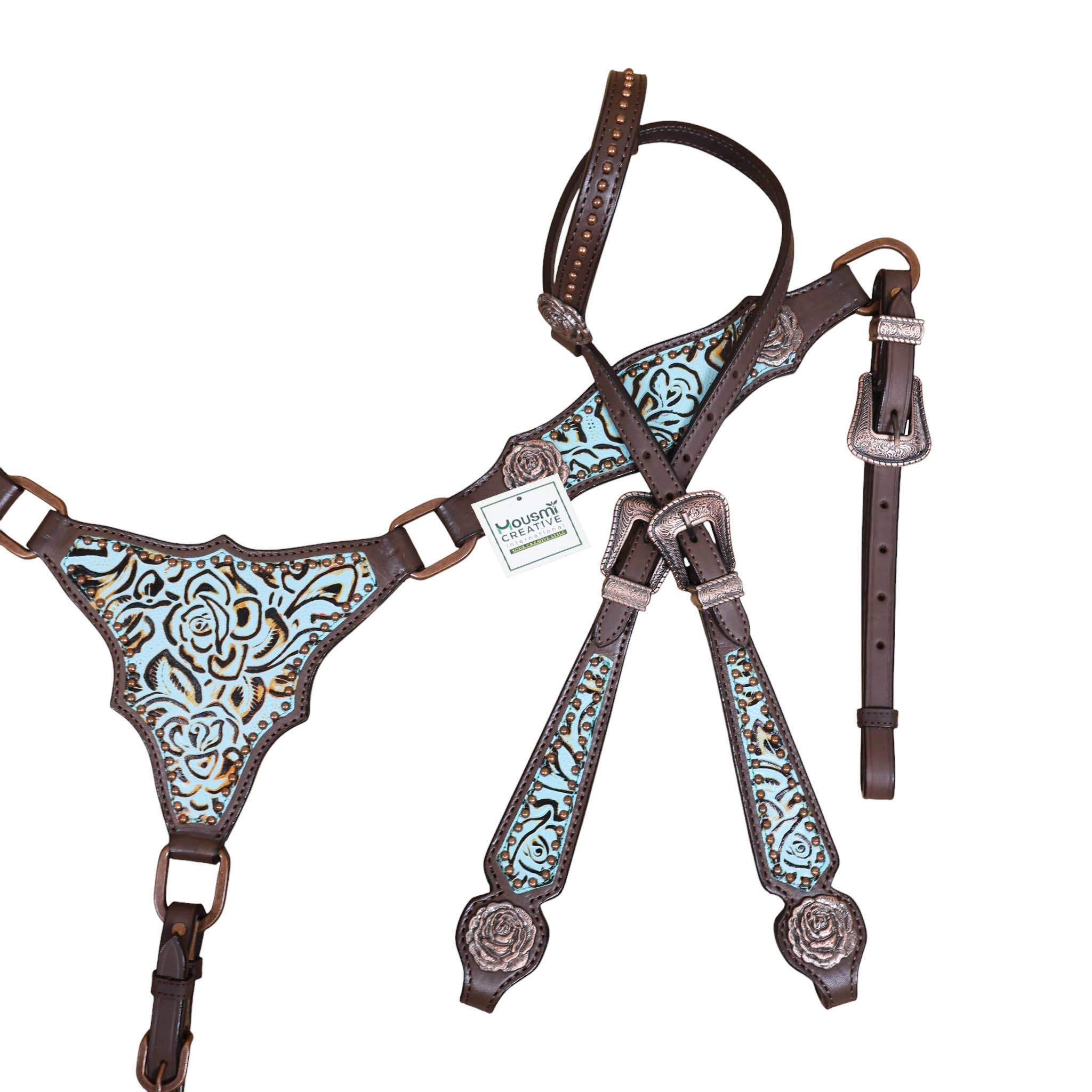 Headstall Type: Western Leather Headstall and Breast Collar tack Set decorated with Turquoise rose embossed leather patches with copper studs and rose hardware