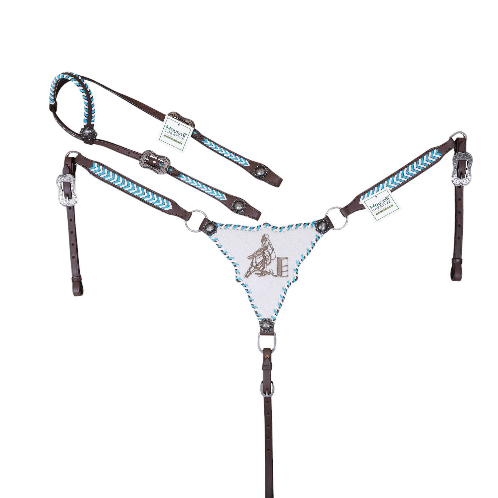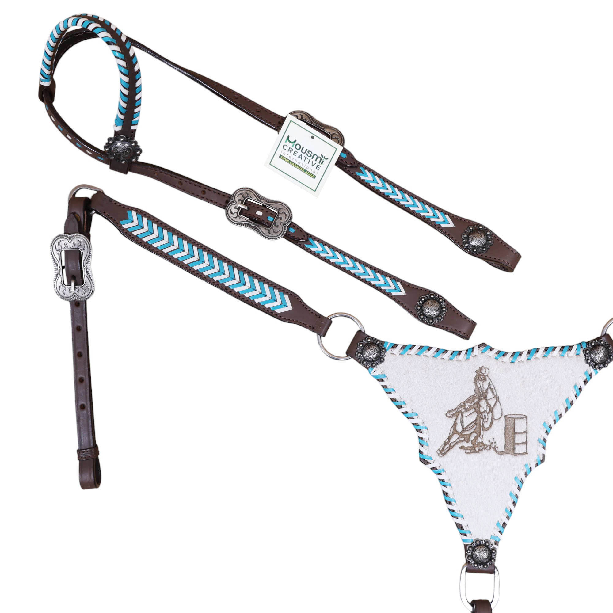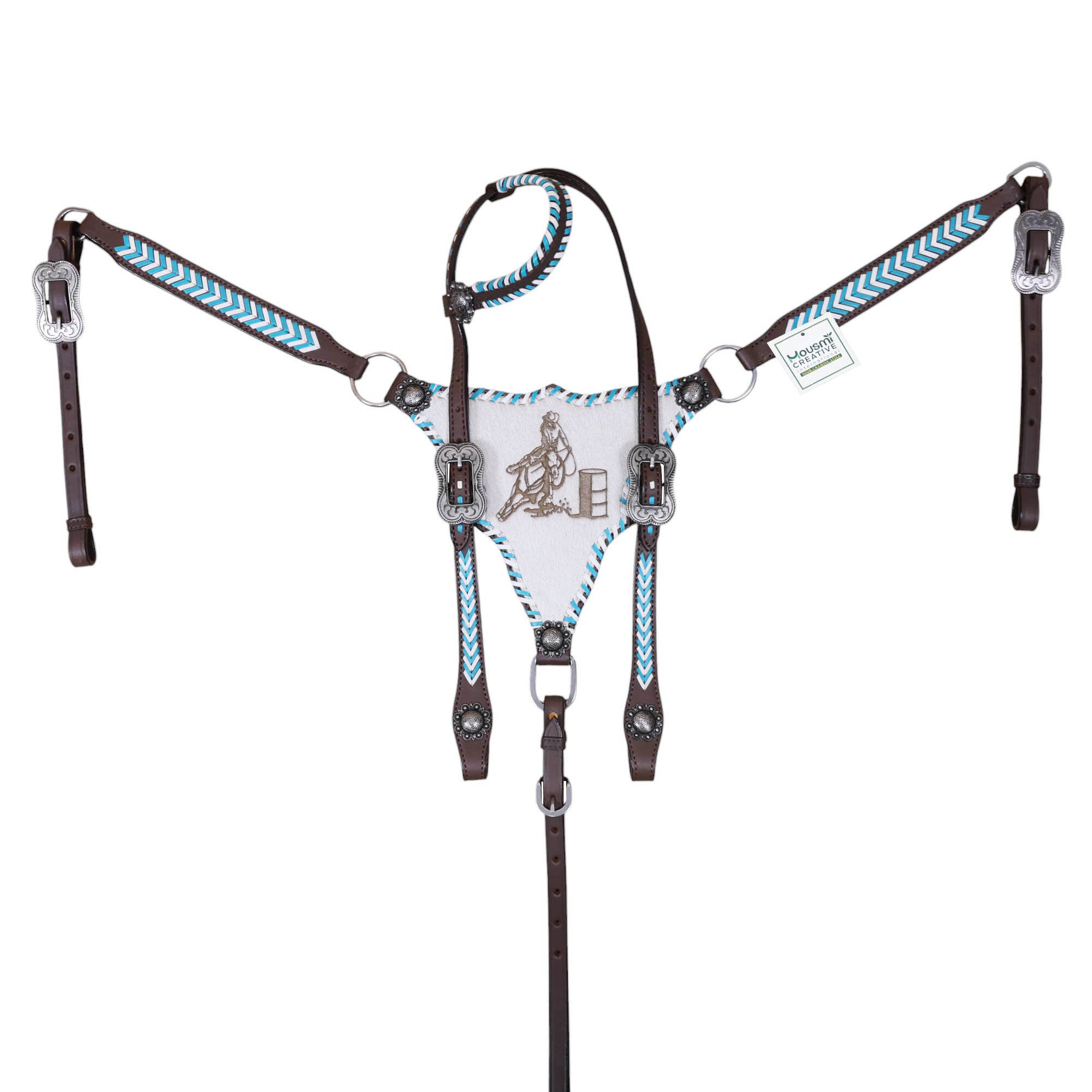 Headstall Type: Western Leather Headstall and Breast Collar tack Set decorated with arrow shape teal and white rawhide braiding on check pieces and gladiator style breast collar with racer motive engraving on white cowhide with teal and white rawhide wipe stitching