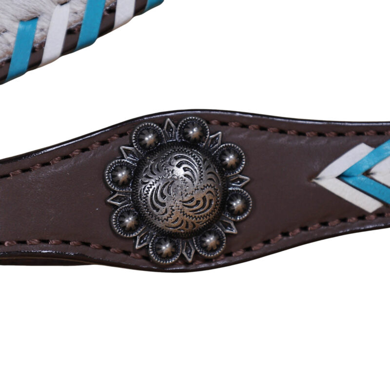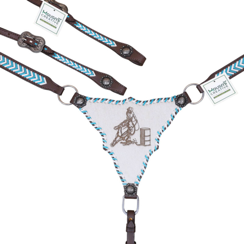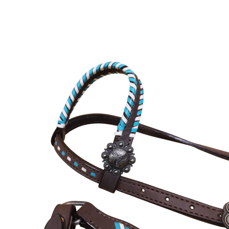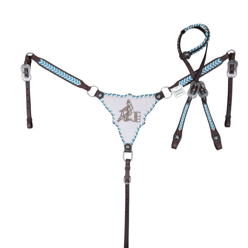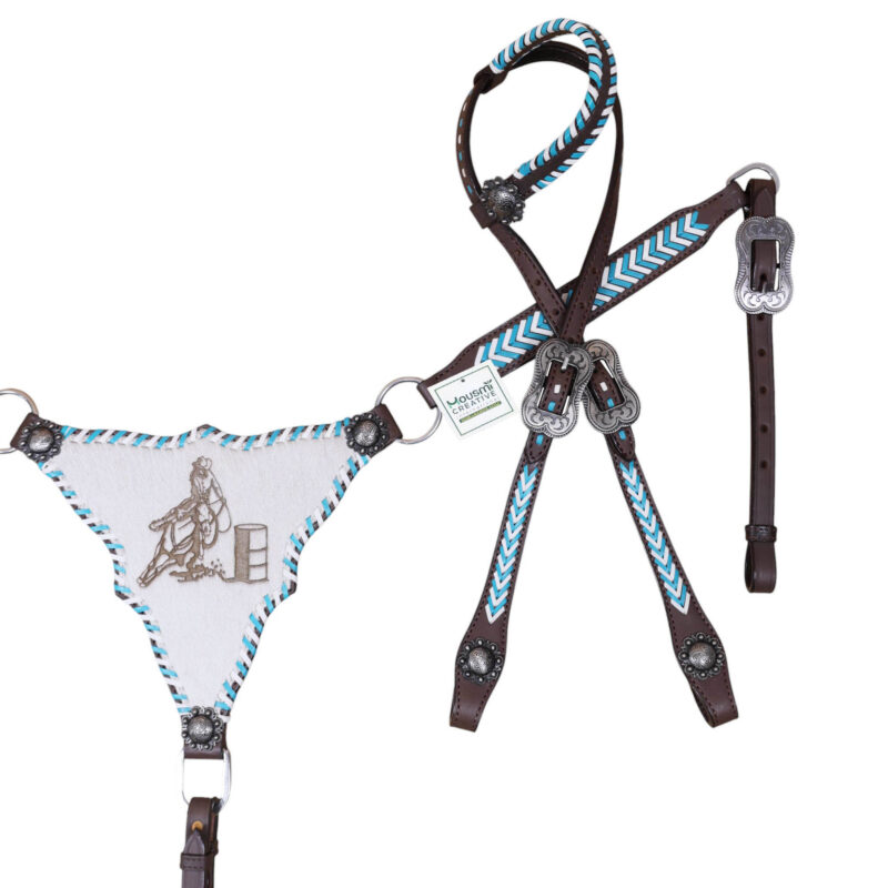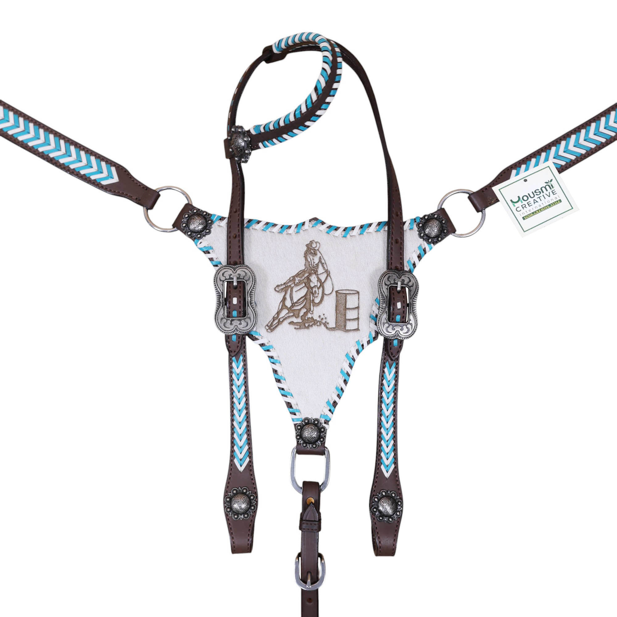 Headstall Type: Western Leather Headstall and Breast Collar tack Set decorated with arrow shape teal and white rawhide braiding on check pieces and gladiator style breast collar with racer motive engraving on white cowhide with teal and white rawhide wipe stitching