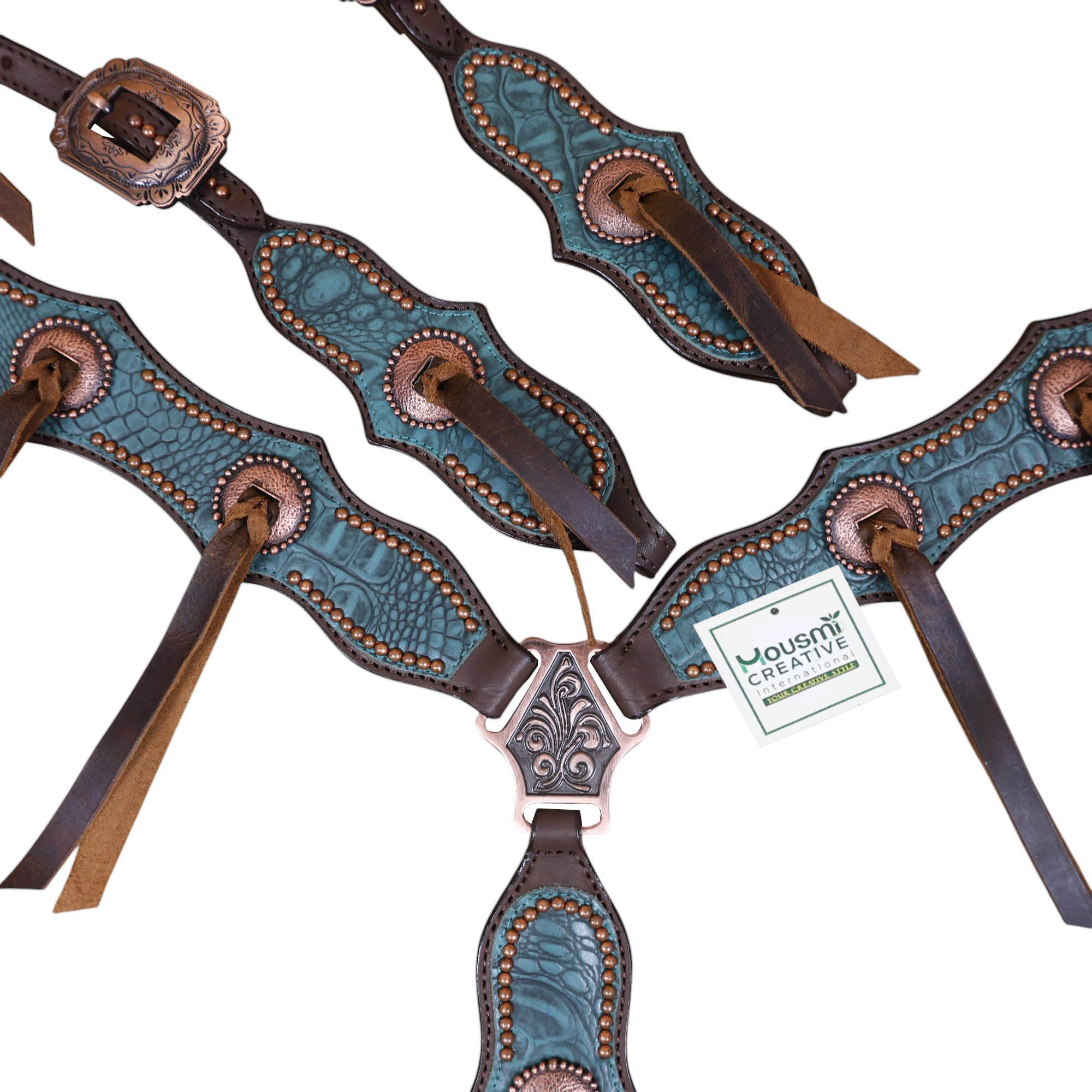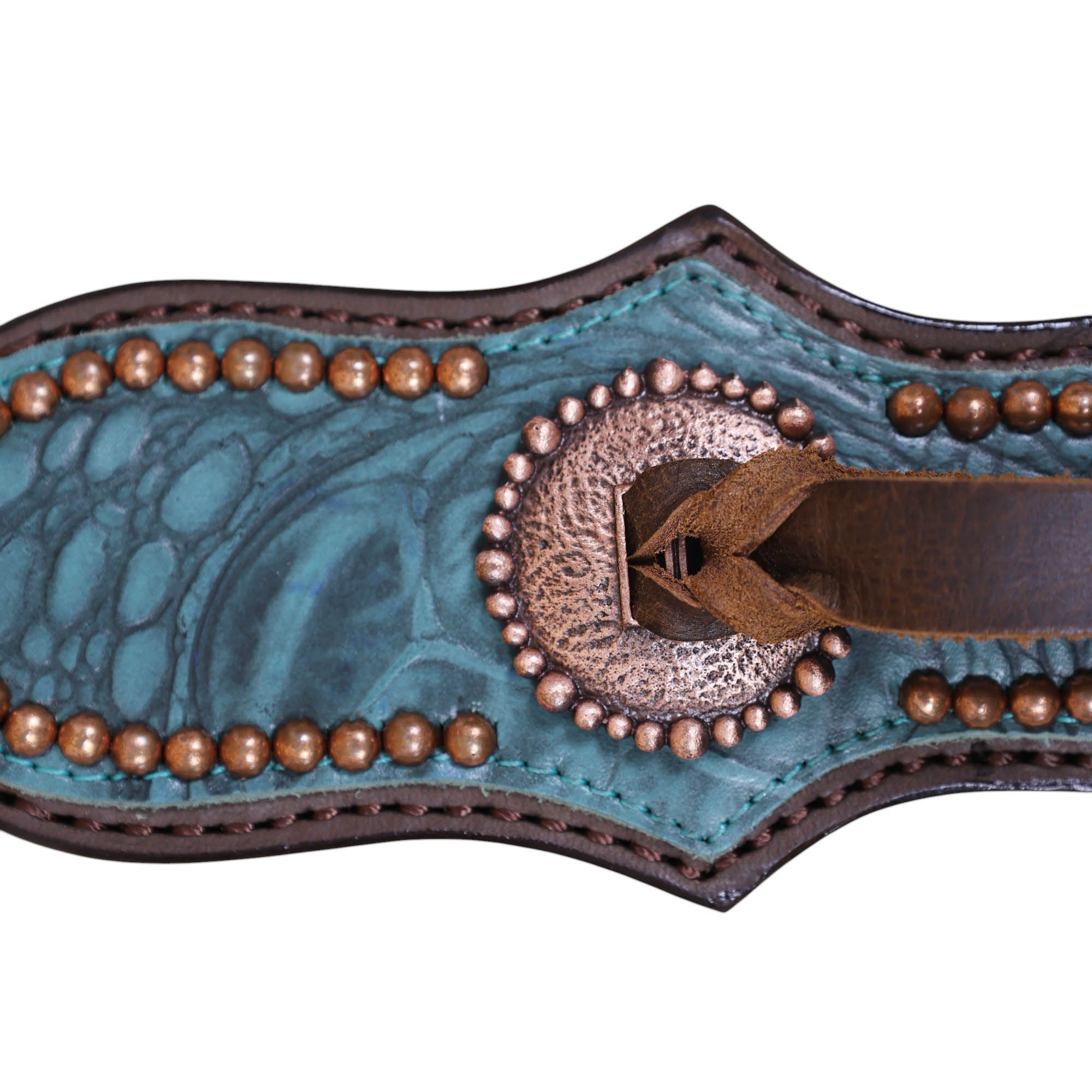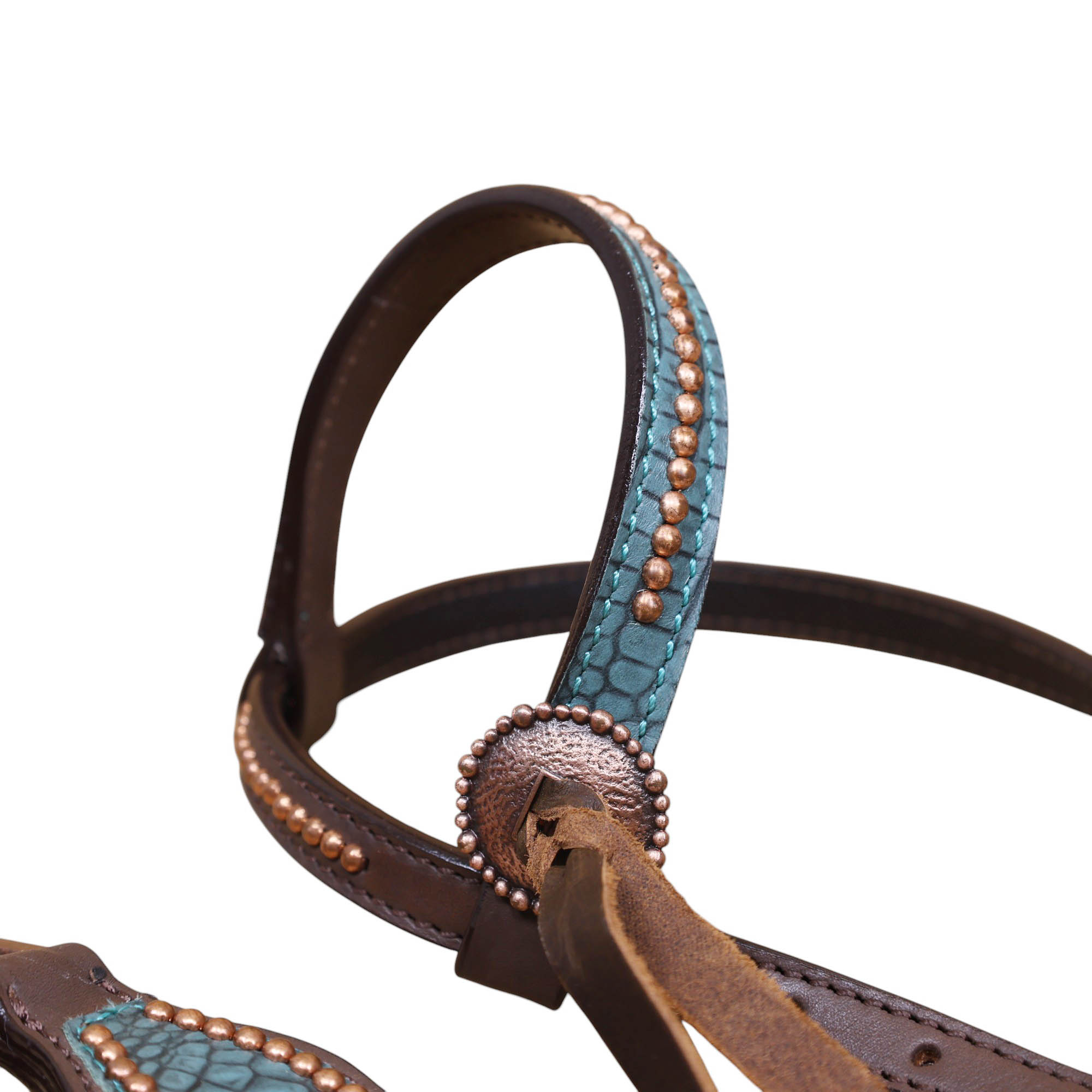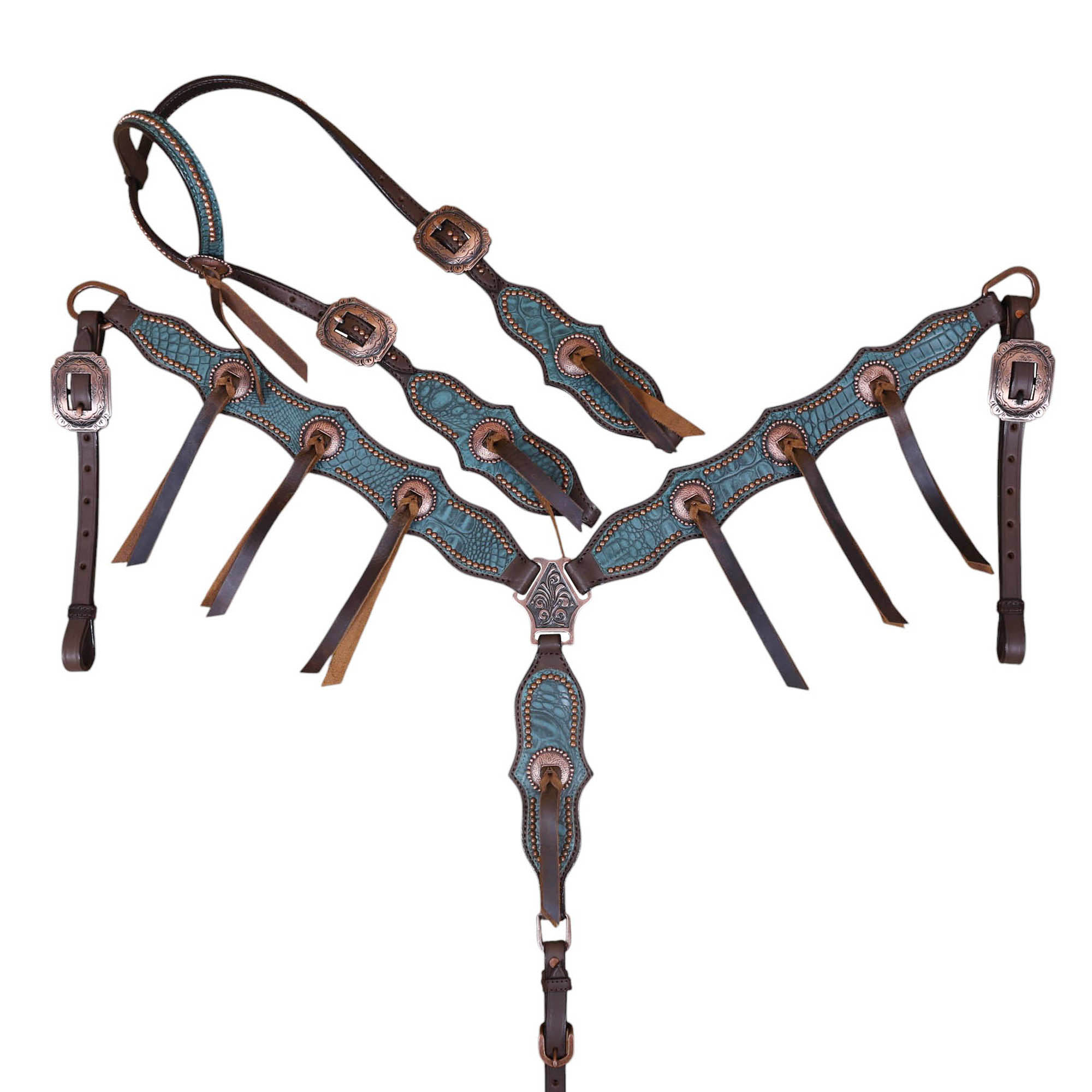 Headstall Type: Western Leather Headstall and Breast Collar tack Set decorated with Copper slot concho with turquoise alligator print leather with copper studs all over