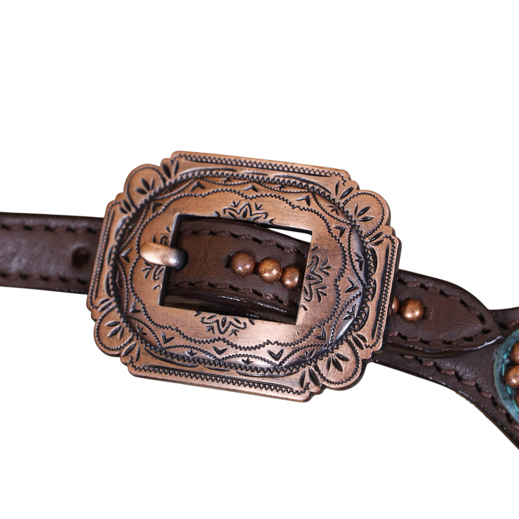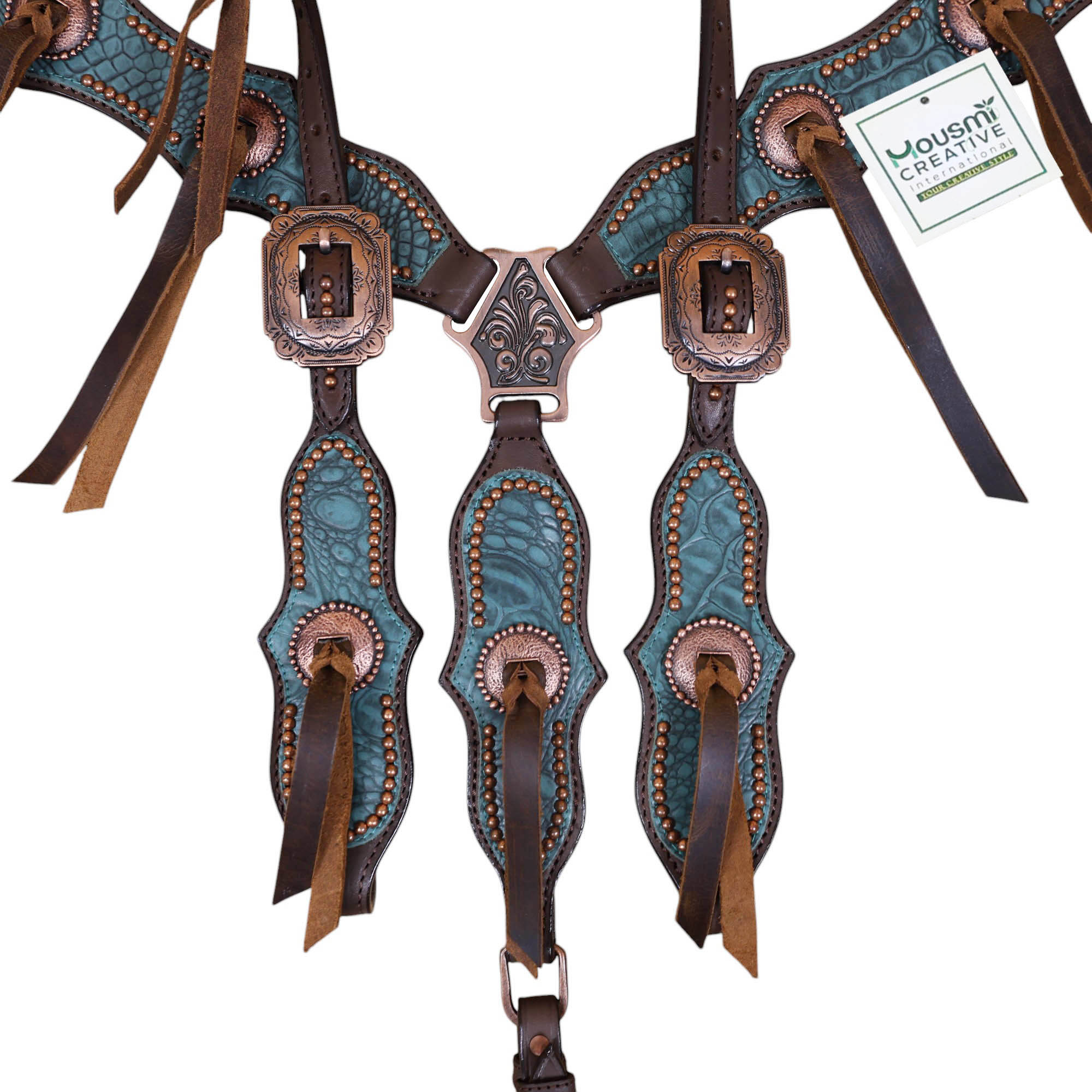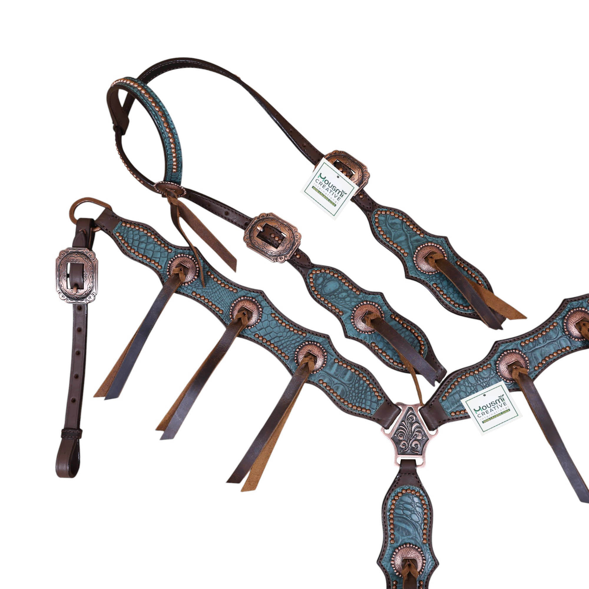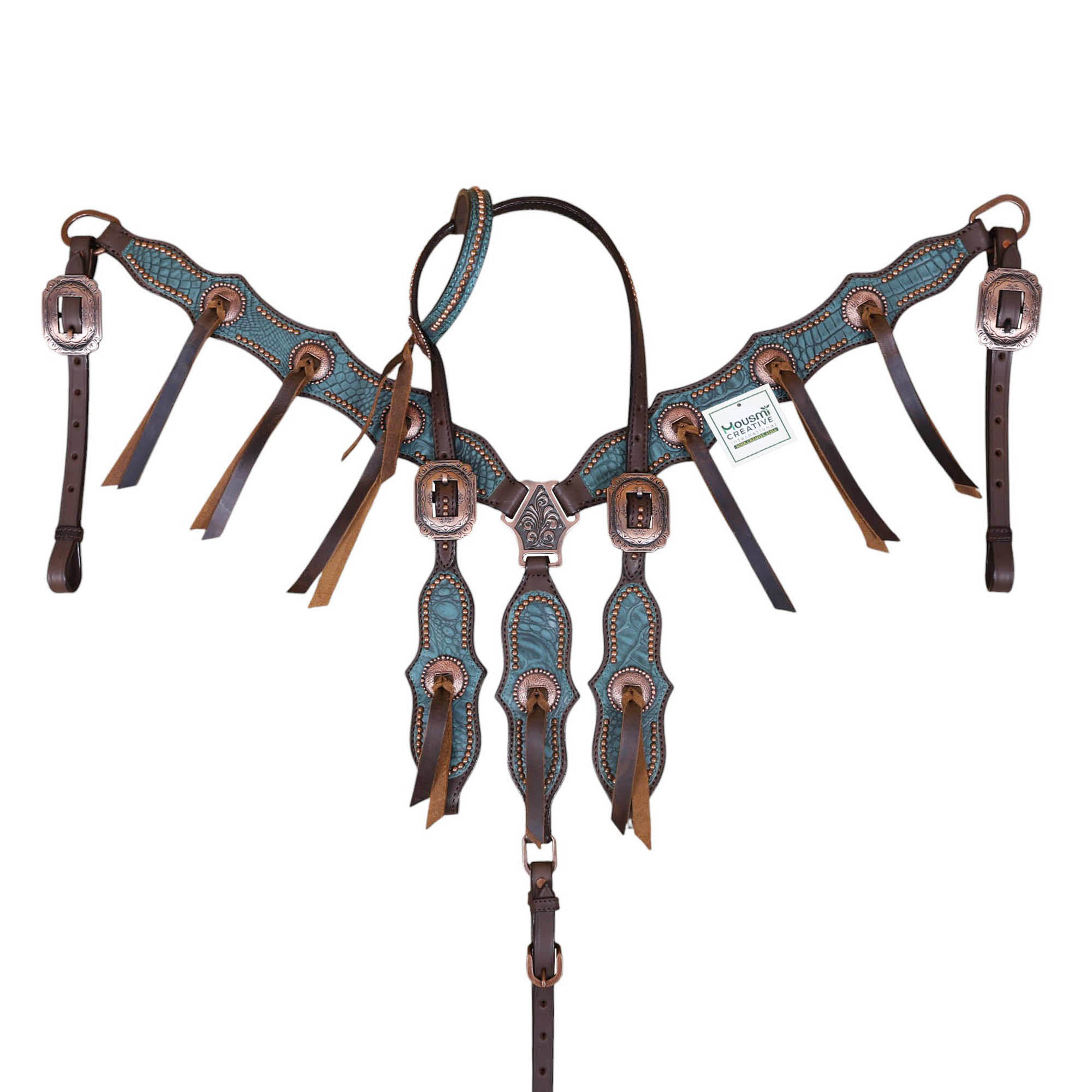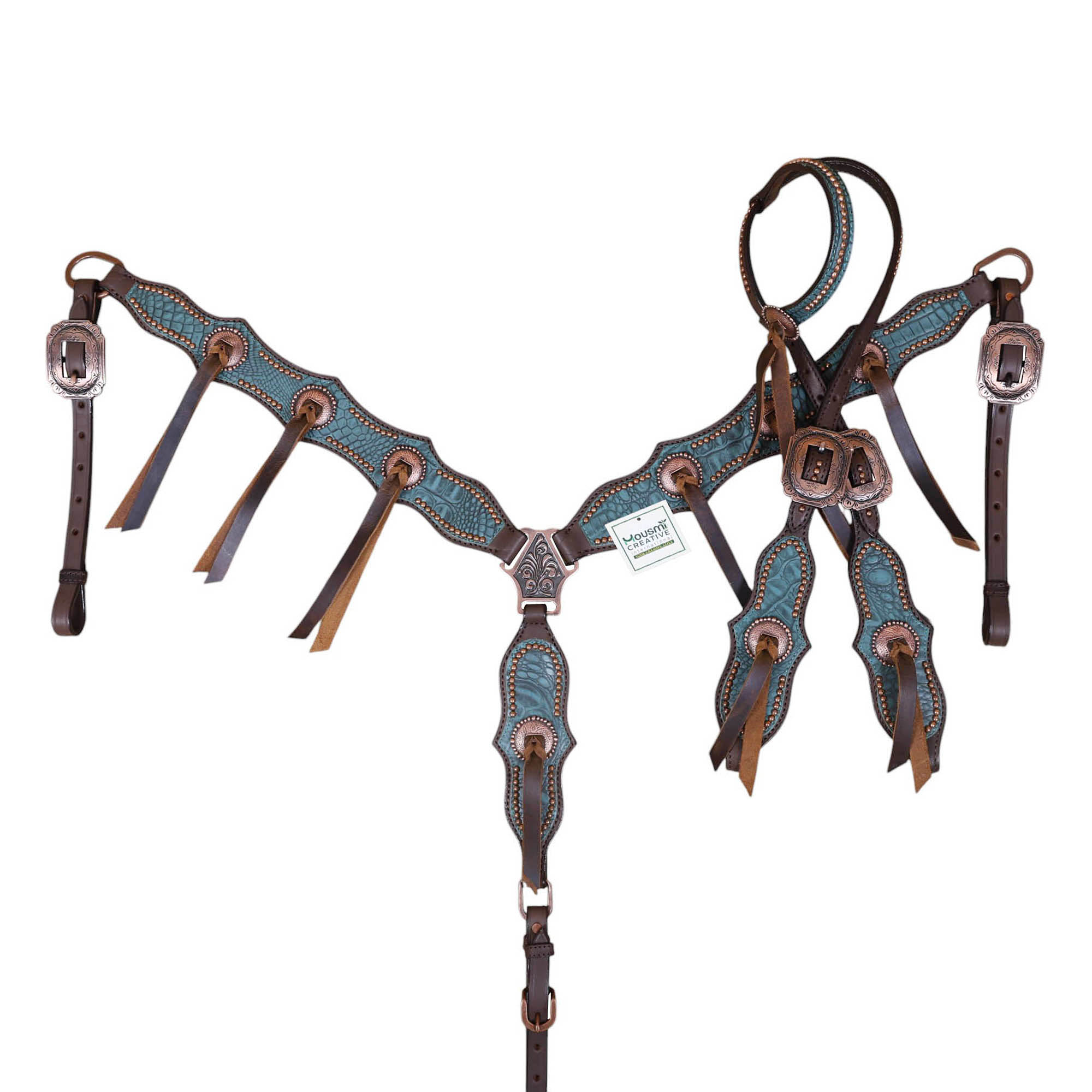 Headstall Type: Western Leather Headstall and Breast Collar tack Set decorated with Copper slot concho with turquoise alligator print leather with copper studs all over