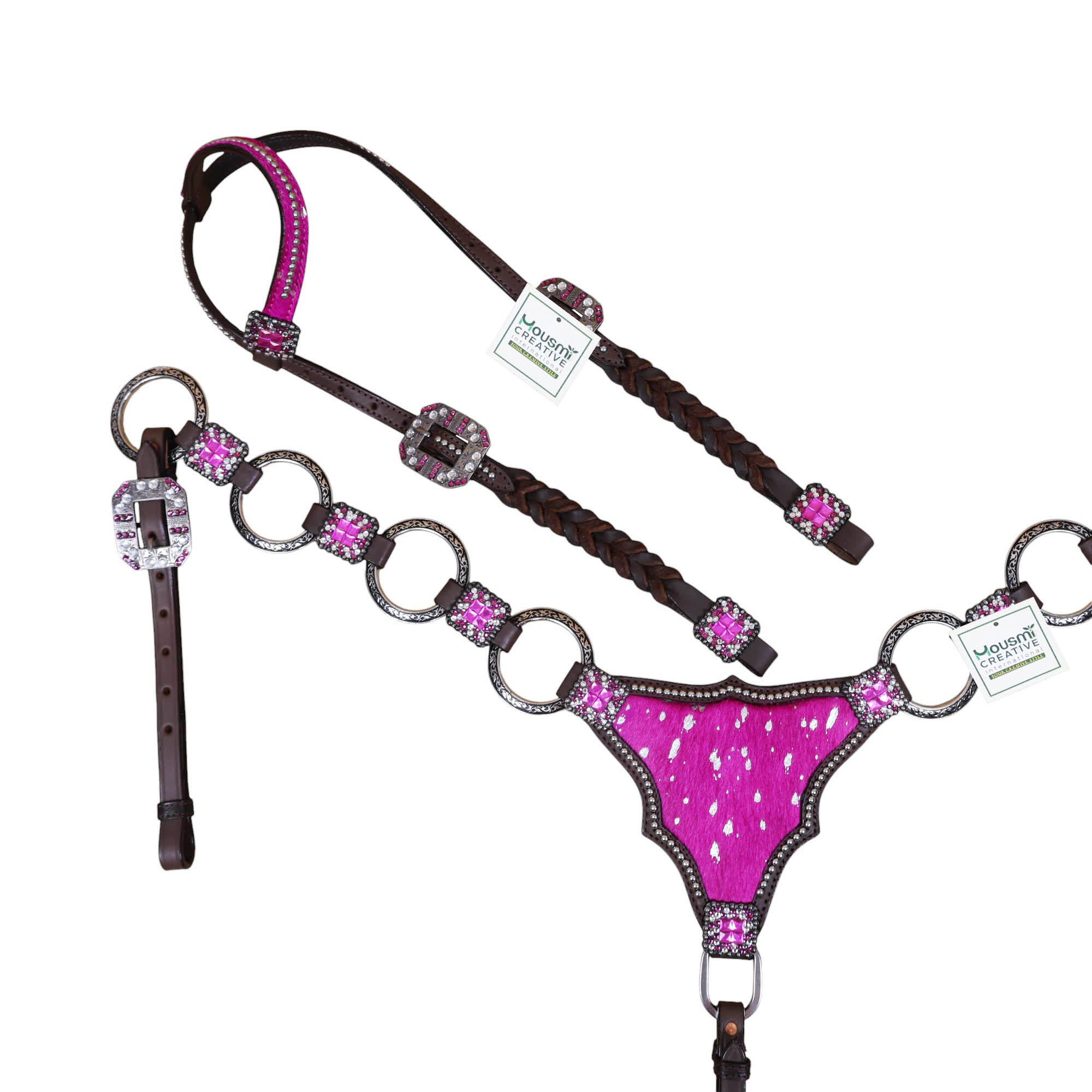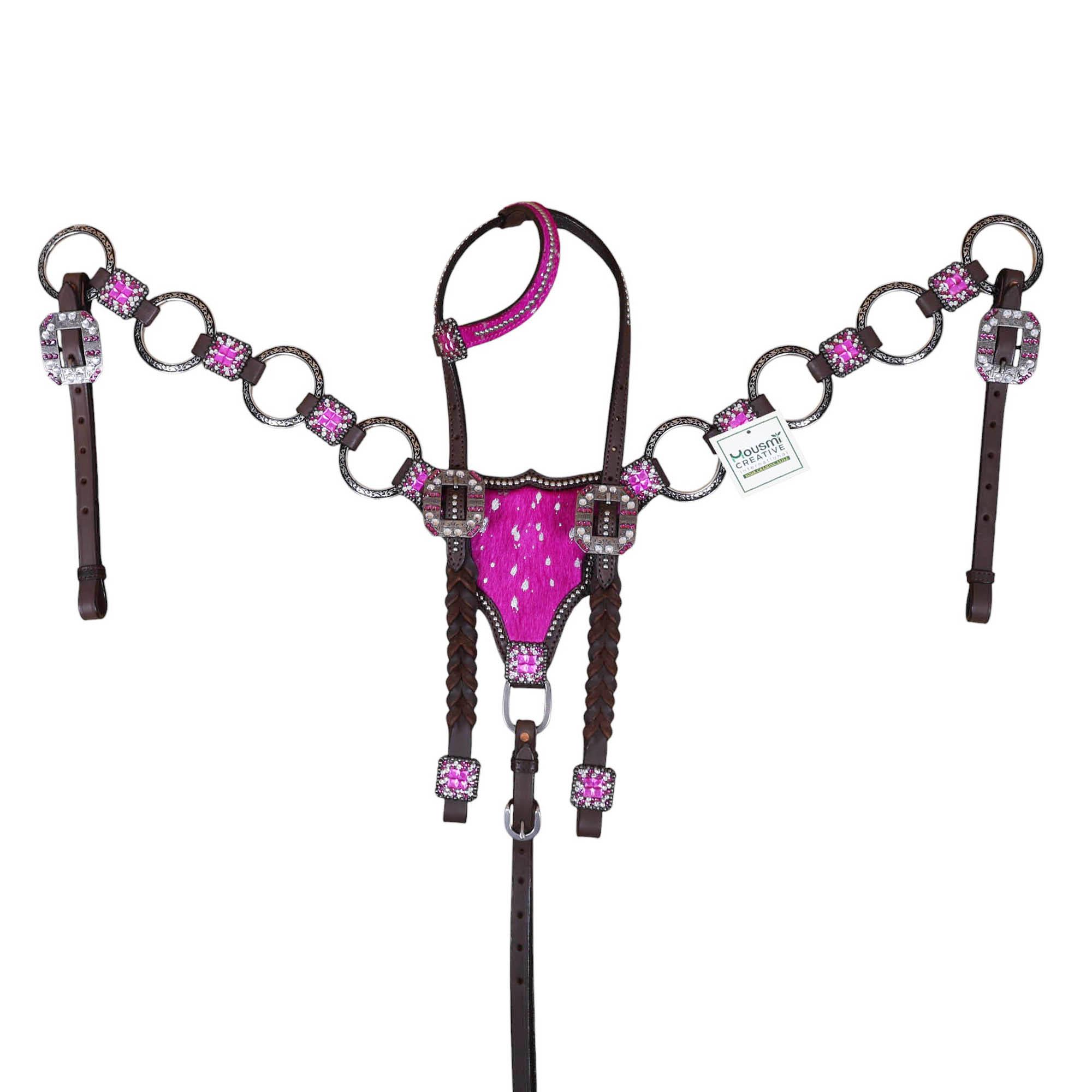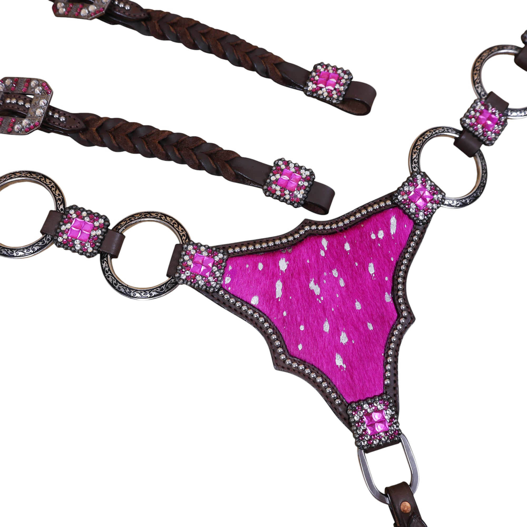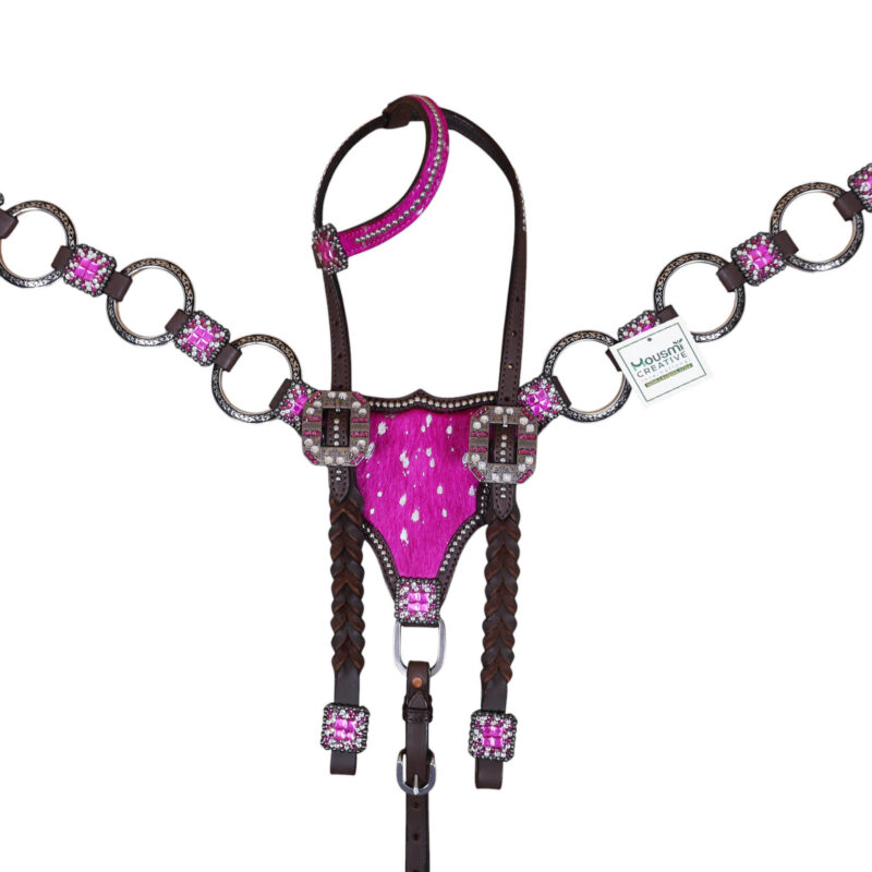 Headstall Type: Western Leather Headstall and Breast Collar tack Set decorated with big rings on pink acid wash gladiator style breast collar having rhinestone concho on it with twisted braided check pieces