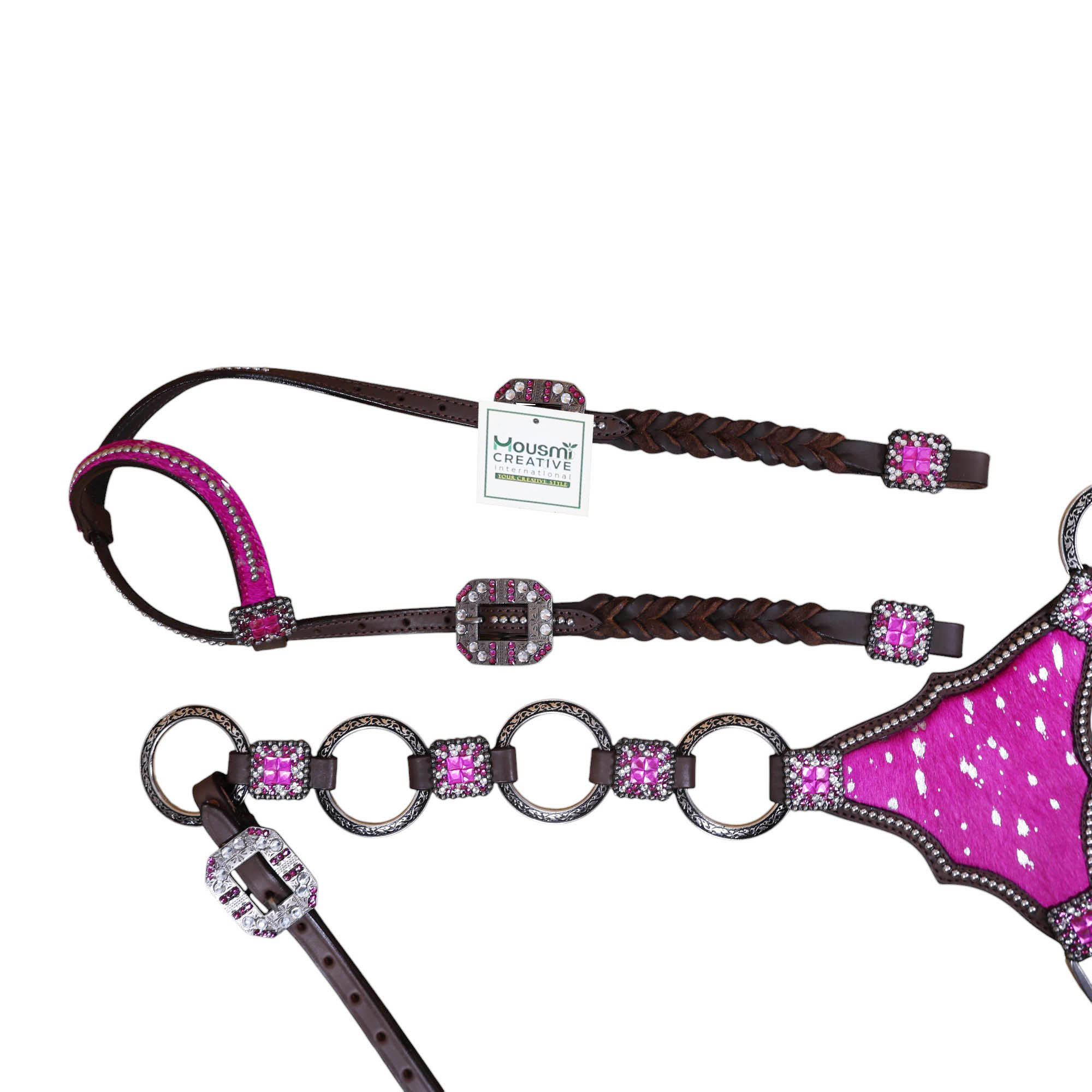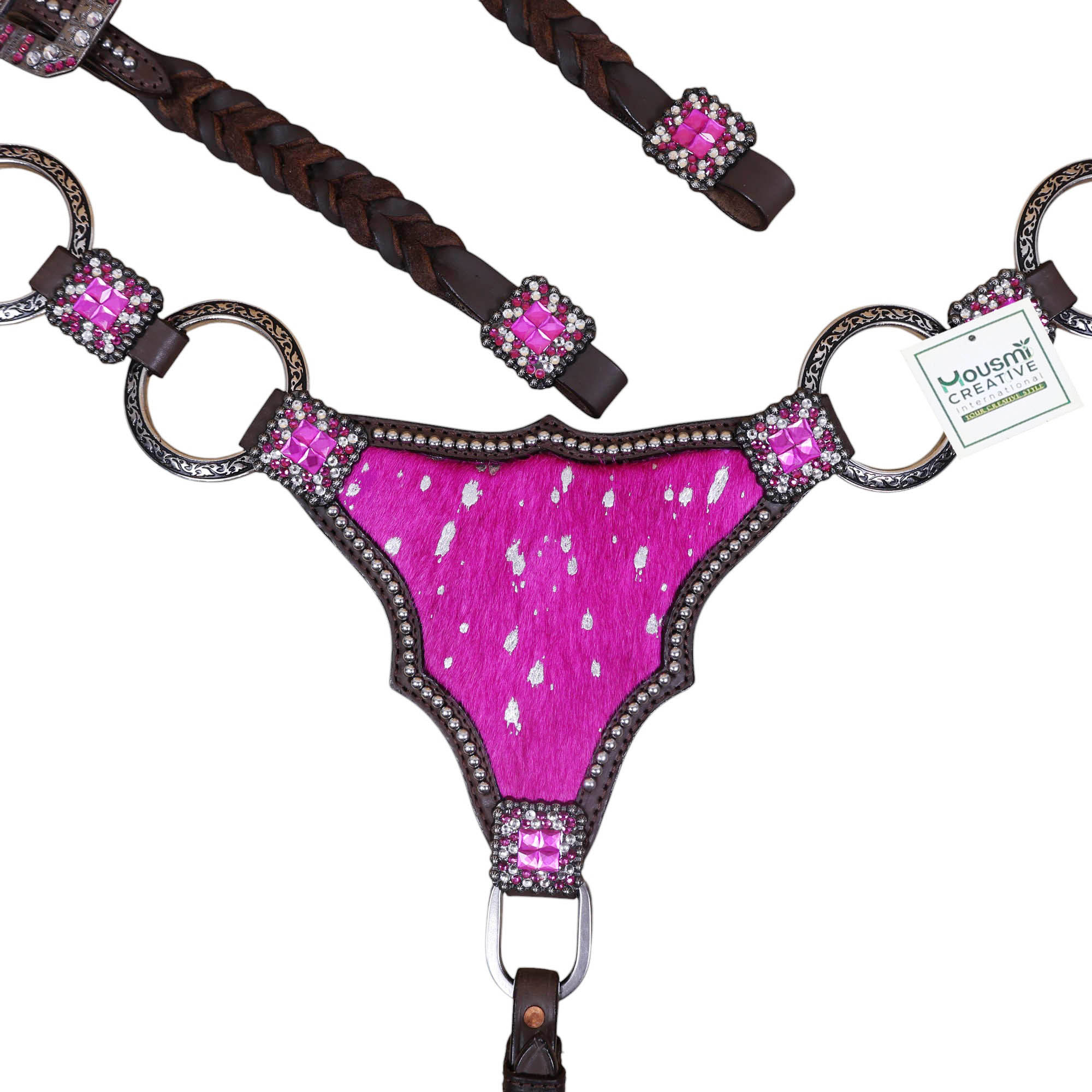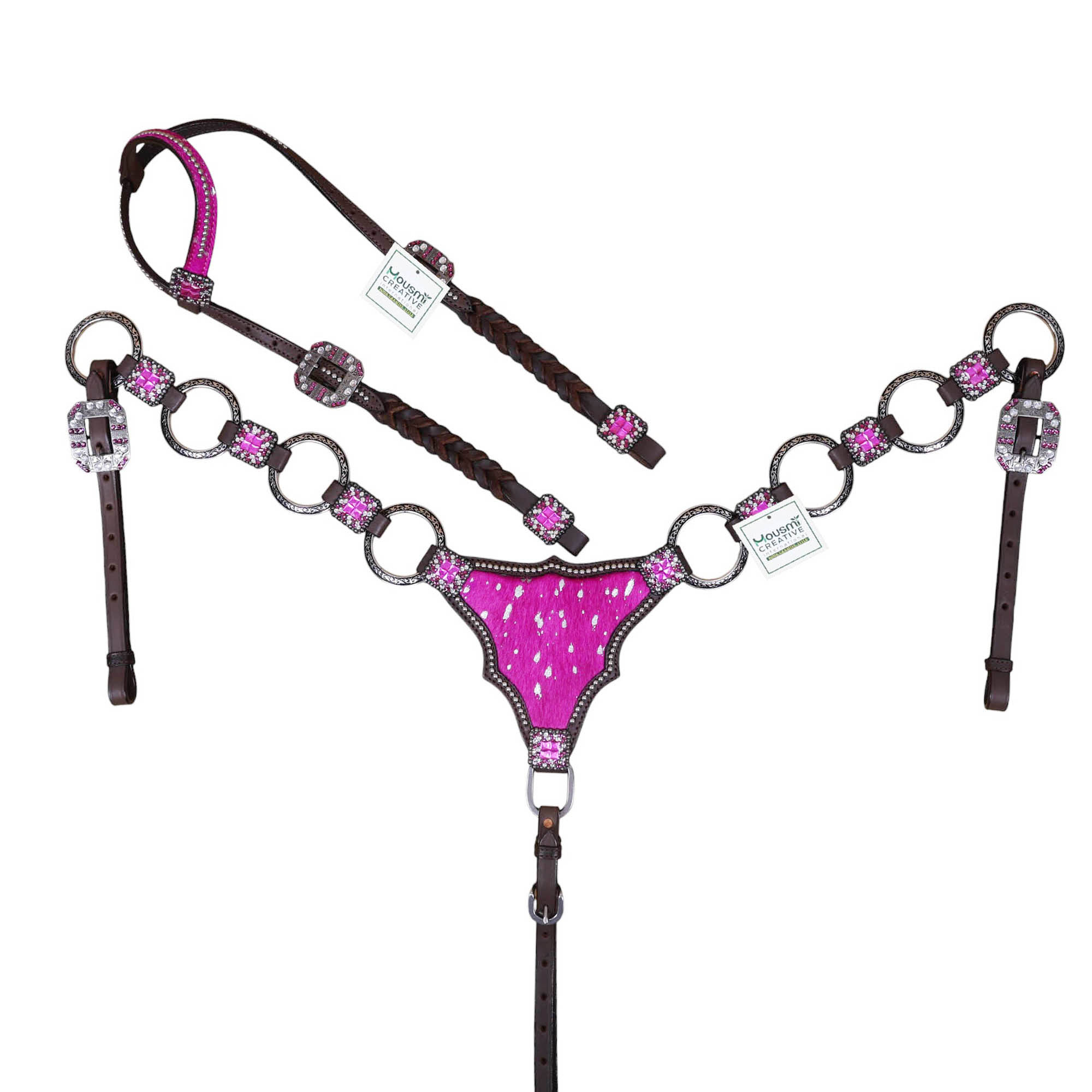 Headstall Type: Western Leather Headstall and Breast Collar tack Set decorated with big rings on pink acid wash gladiator style breast collar having rhinestone concho on it with twisted braided check pieces