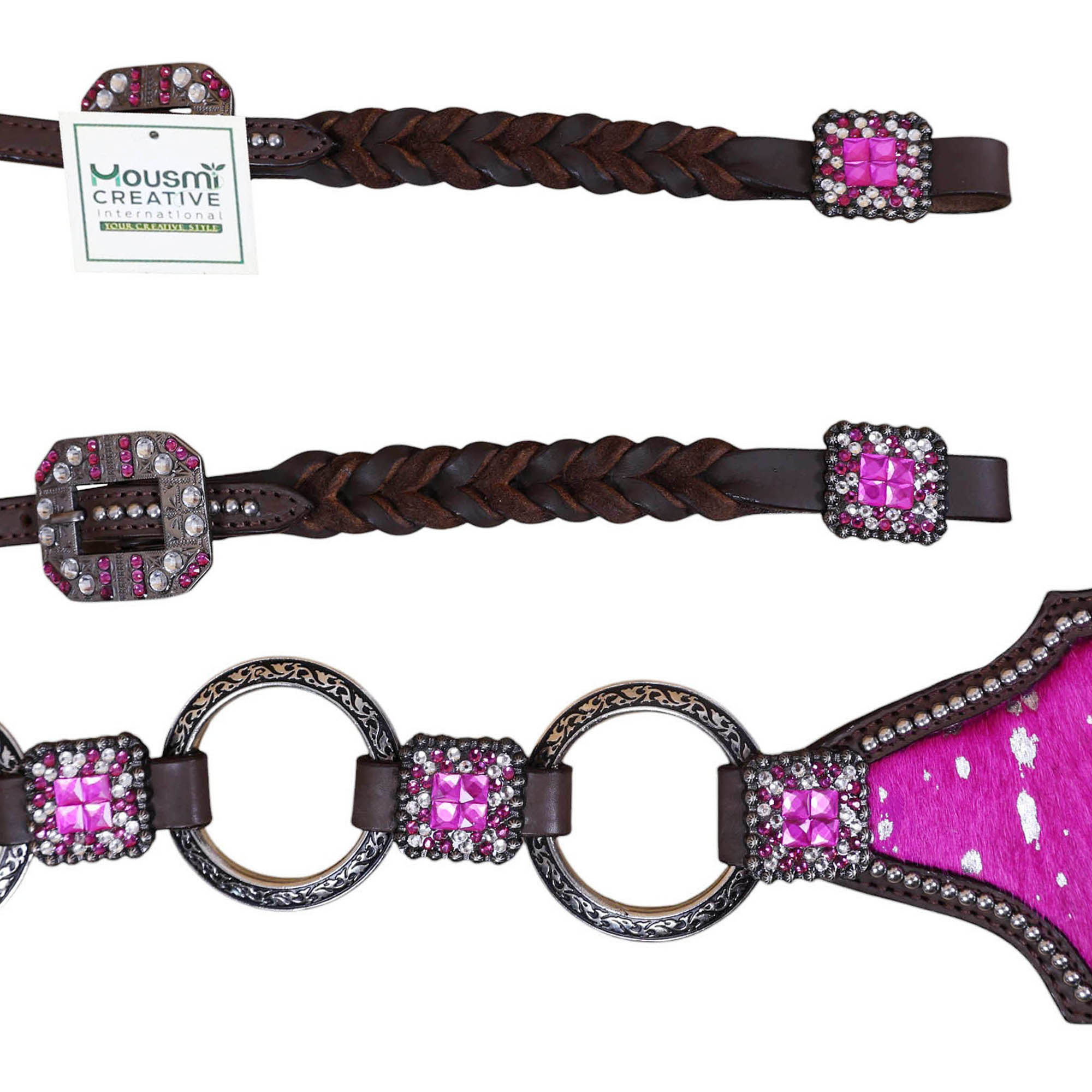 Bulk production of Headstall and Breast Collar tack Set, Western Leather Headstall Breast Collar Set: Western Headstall & Breast Collar Set: Pink Acid Wash, Rhinestone Concho (HSBM 114416)