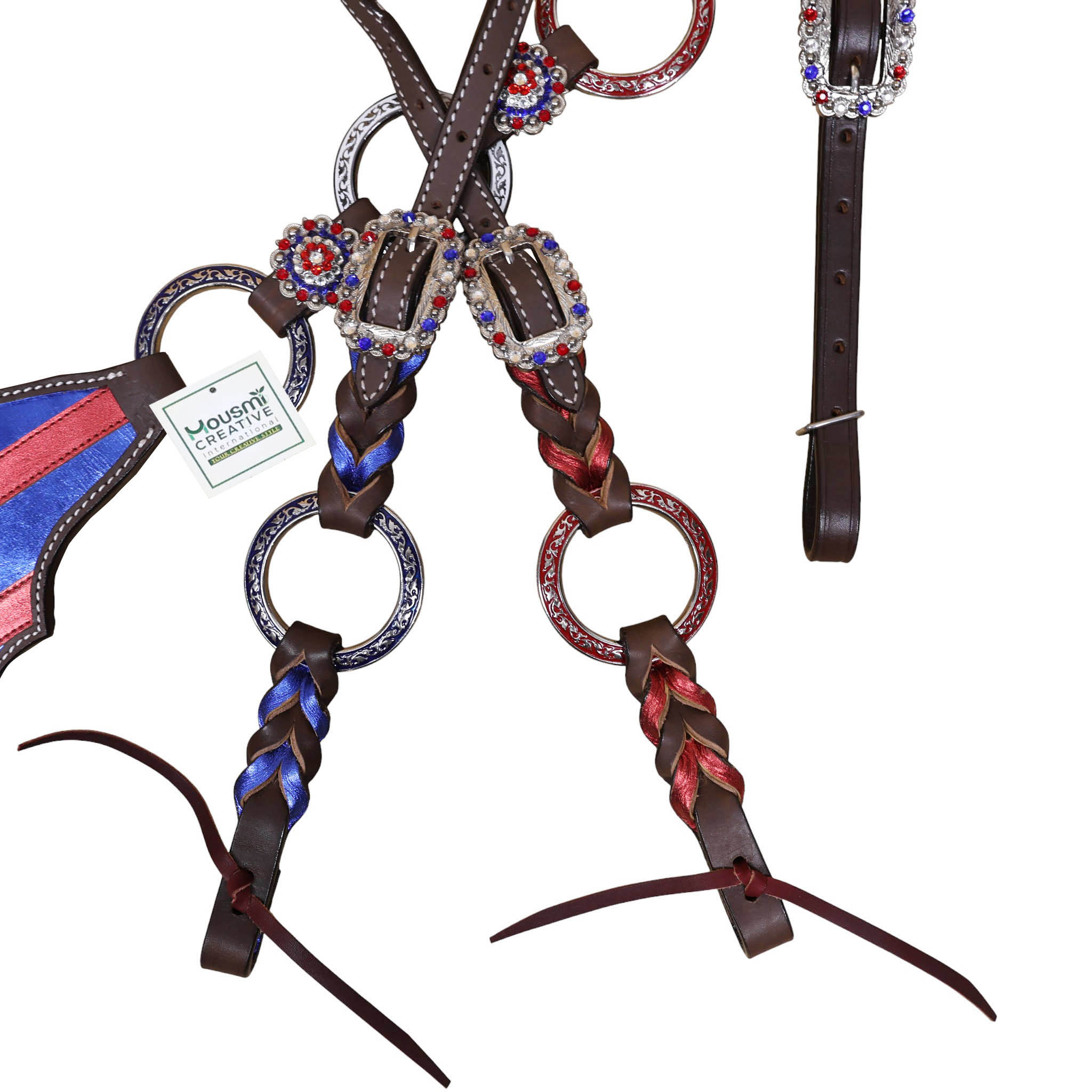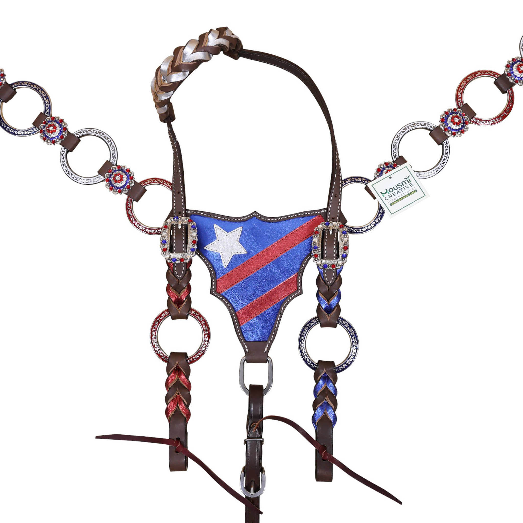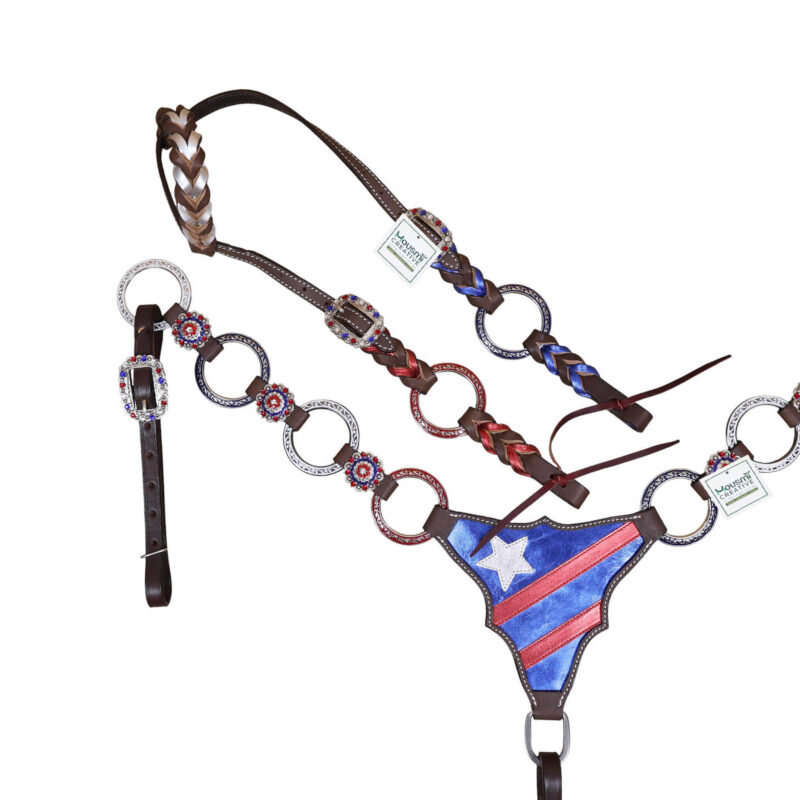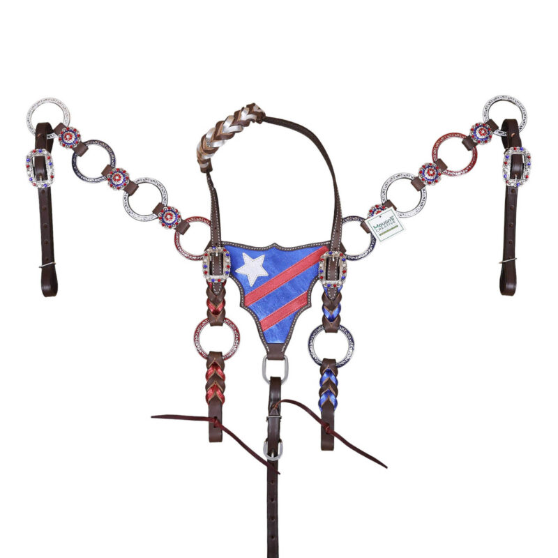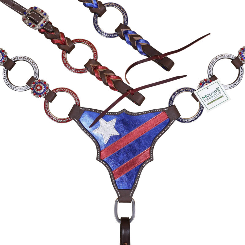Headstall Type: Headstall and Breast Collar tack Set decorated with tack Set decorated with Red royal white rings flag design at center and criss cross braiding on one ear and cheek piece on cheek piece and one ear