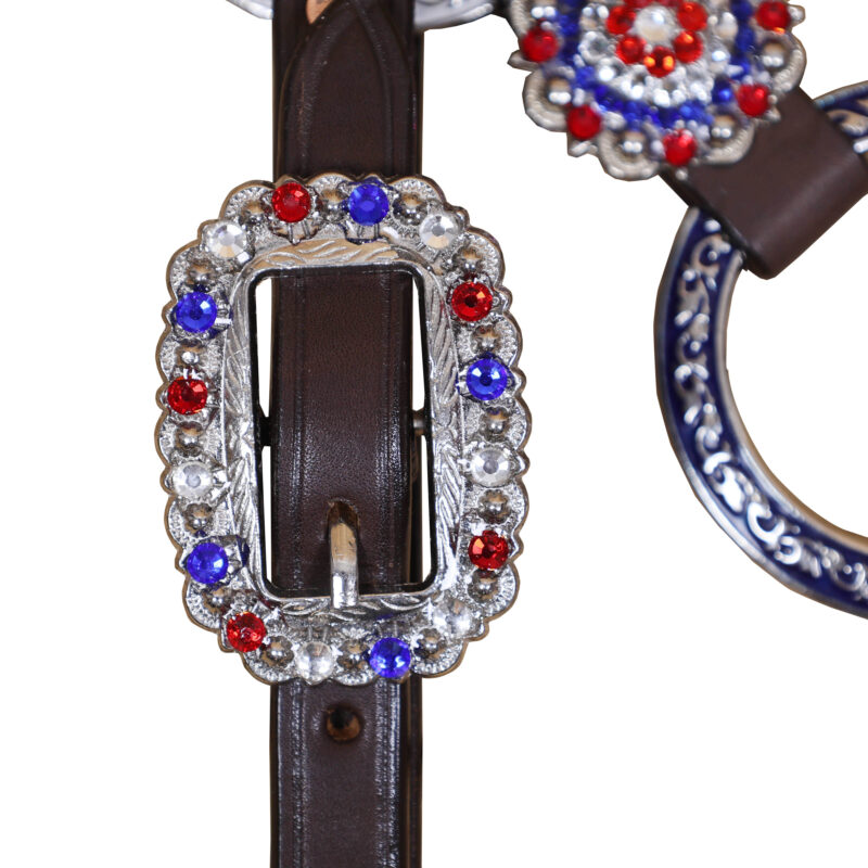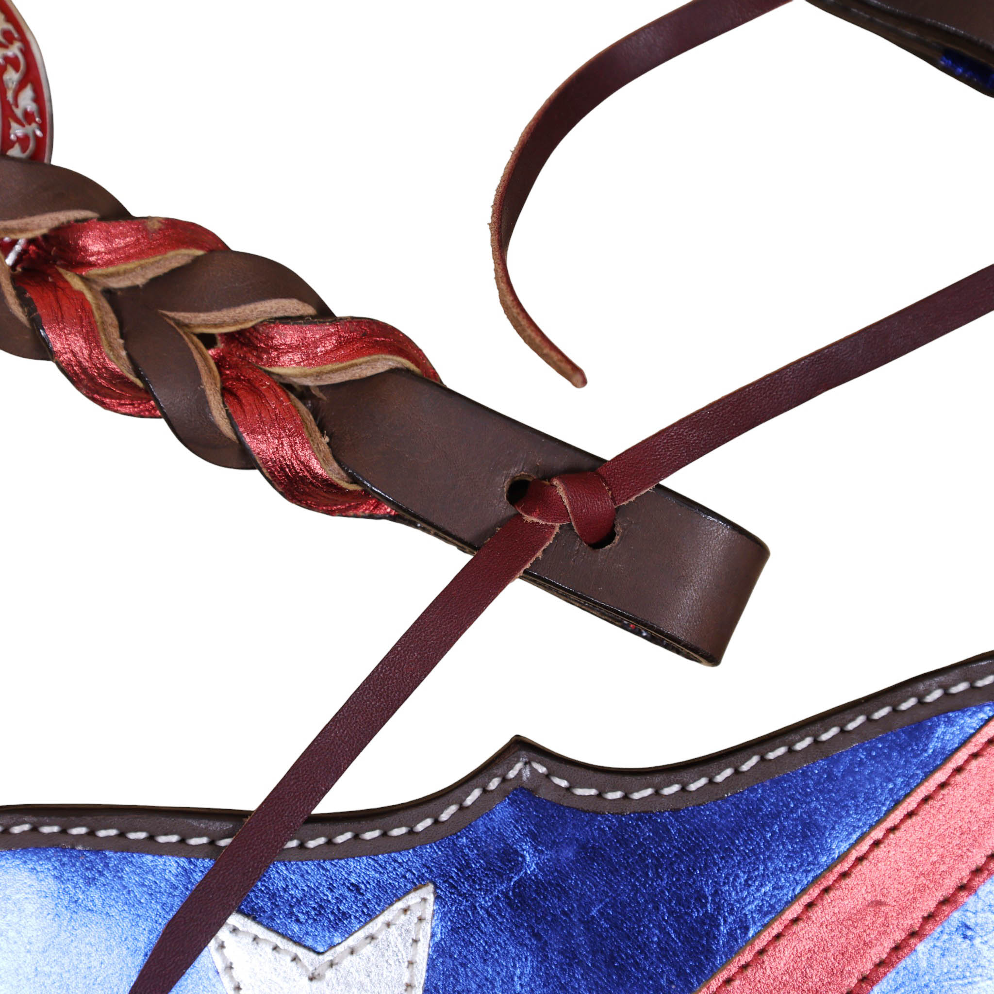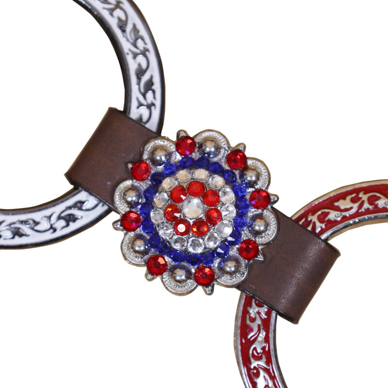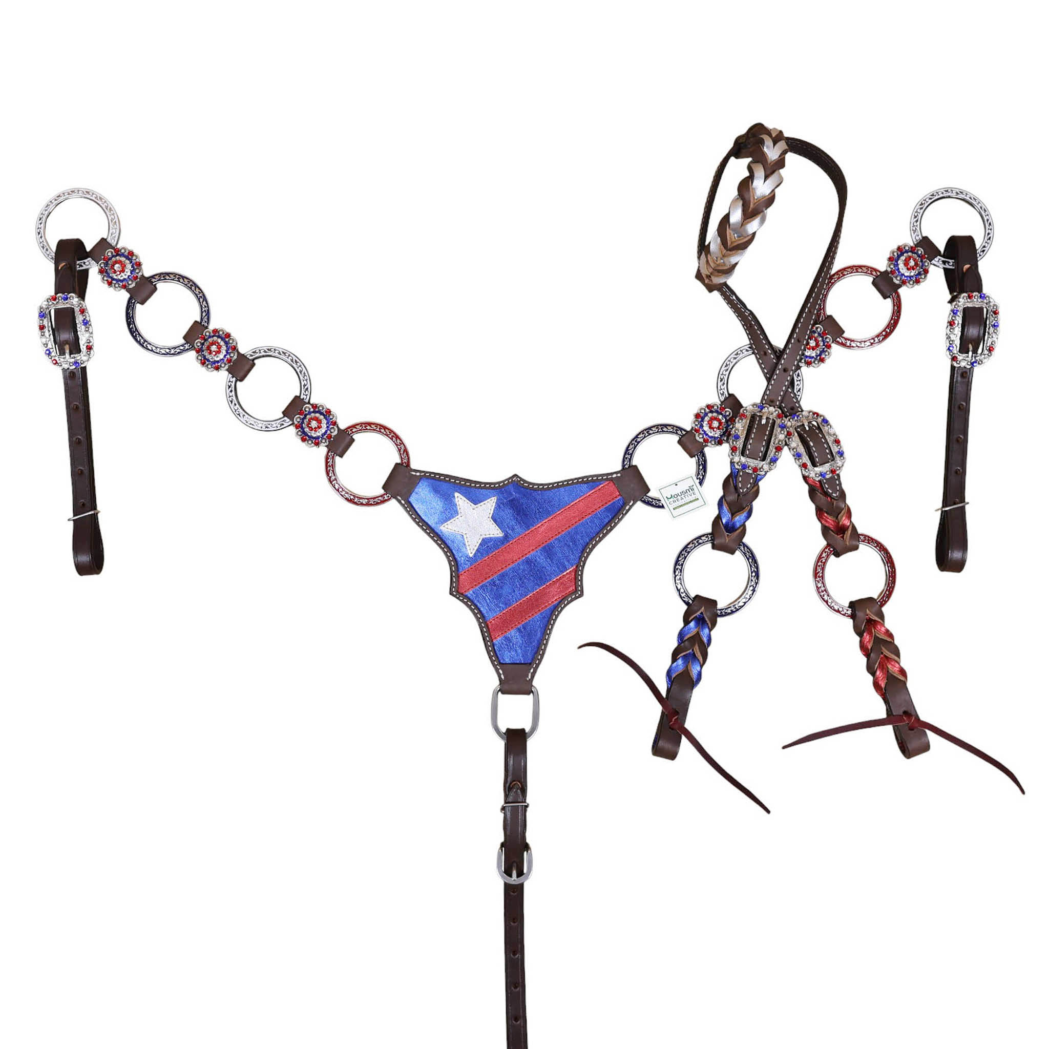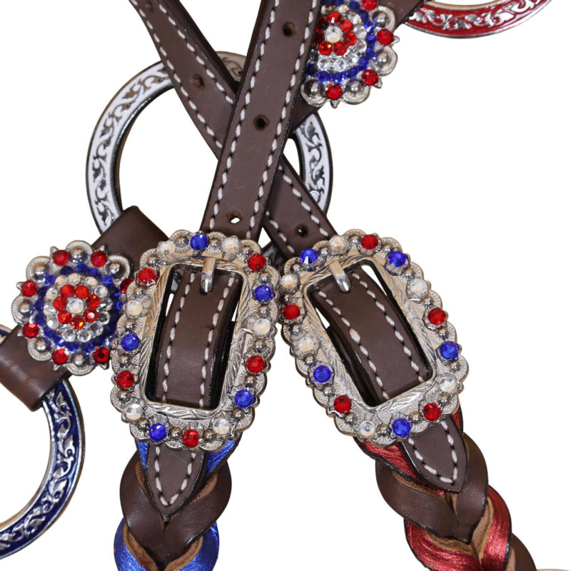 Headstall Type: Headstall and Breast Collar tack Set decorated with tack Set decorated with Red royal white rings flag design at center and criss cross braiding on one ear and cheek piece on cheek piece and one ear