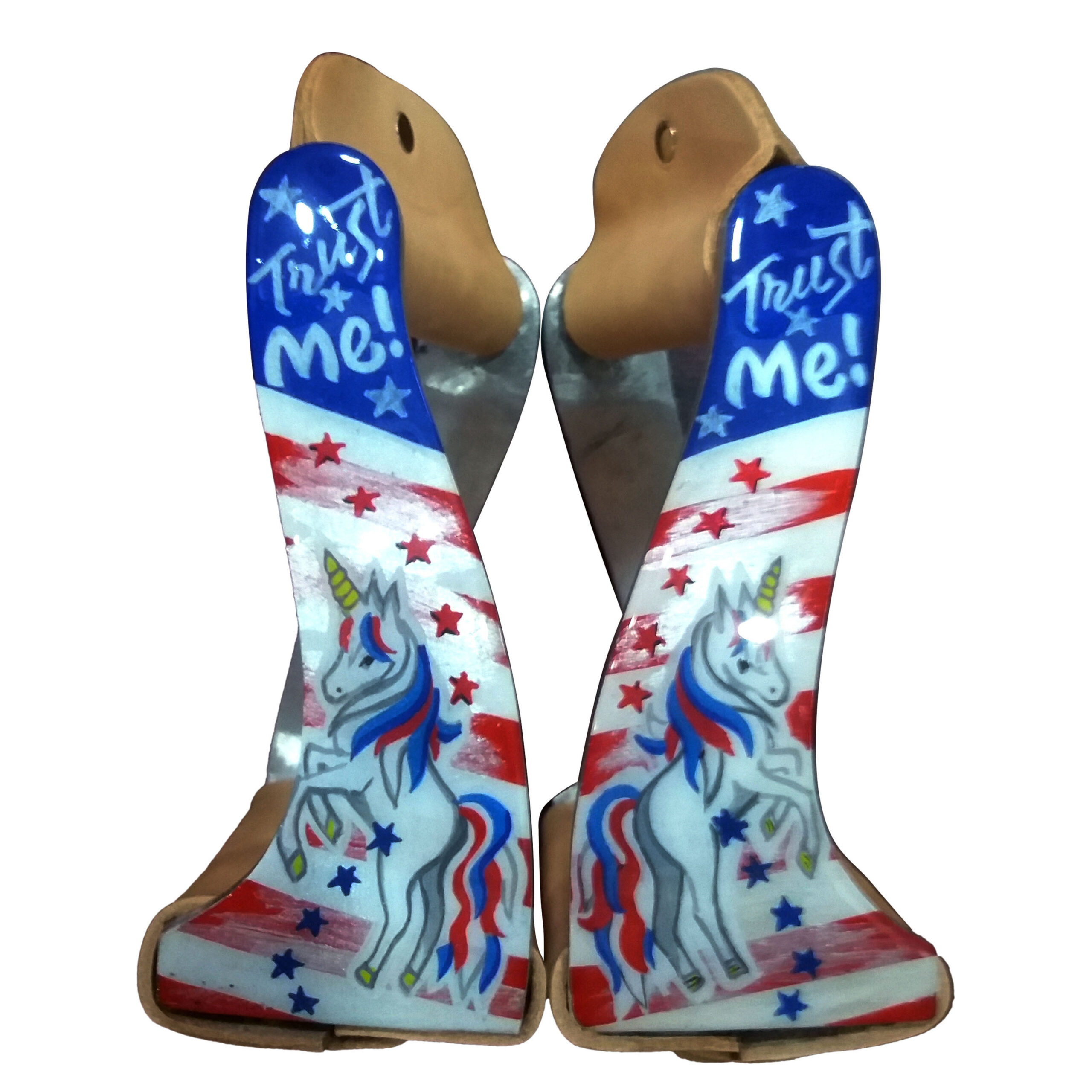 Western Equestrian Horse Riding Lightweight Aluminium Stirrups. This Twisted Angle Aluminium Stirrups are Decorated With Hand Painted Slogans and Illustrations and have Anti Slip Rough Leather Covered Treads. Choose us for Exceptional Craftsmanship, A Commitment to Quality and Personalized Customer Service.