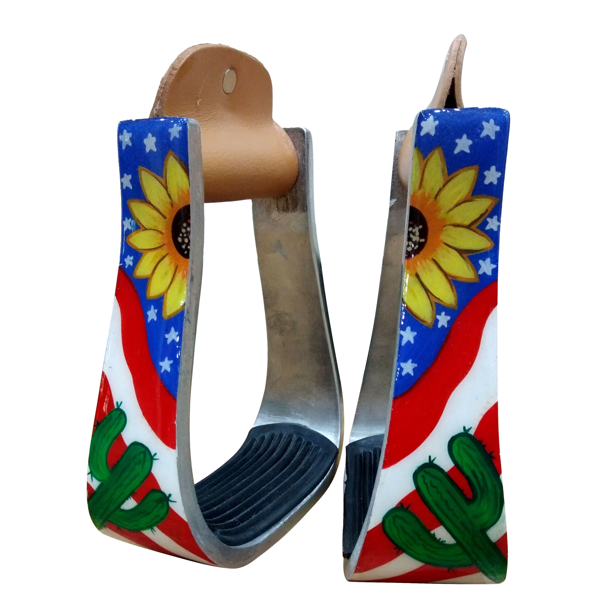 Western Equestrian Horse Riding Lightweight Aluminium Stirrups. This Barrel Type Aluminium Stirrups are Decorated With Hand Painted Slogans and Illustrations and have Anti Slip Black Rubber Treads. Choose us for Exceptional Craftsmanship, A Commitment to Quality and Personalized Customer Service.