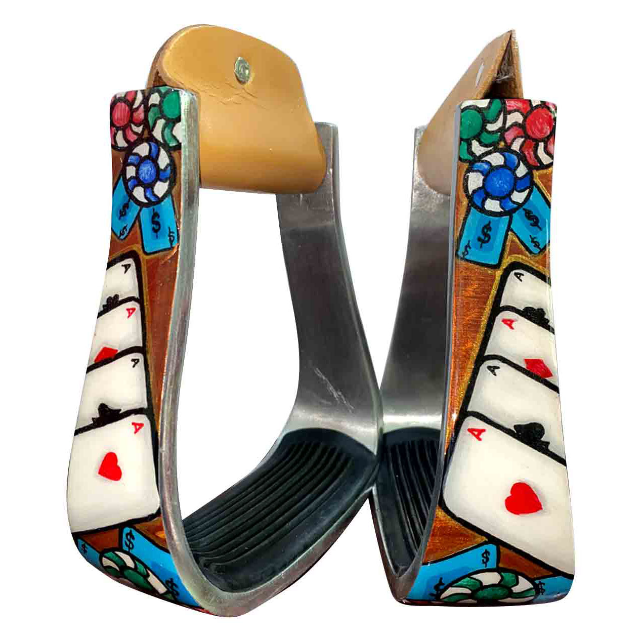 Western Equestrian Horse Riding Lightweight Aluminium Stirrups. This Horse Barrel Aluminium Stirrups are Decorated With Hand Painted Slogans and Illustrations and have Anti Slip Black Rubber Treads. Choose us for Exceptional Craftsmanship, A Commitment to Quality and Personalized Customer Service.