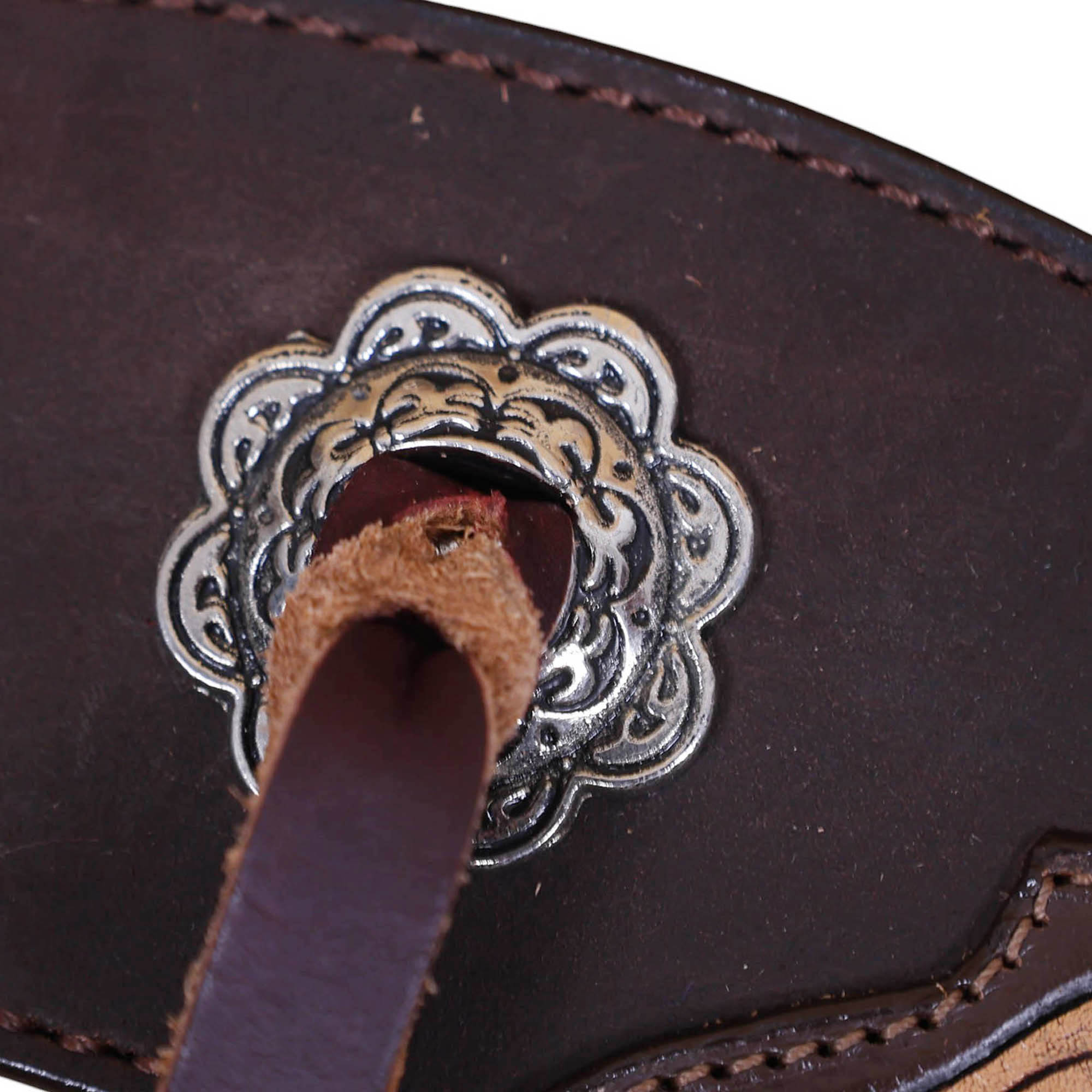 Headstall Type: Western Headstall and Breast Collar tack Set decorated witha ntic Nickel slot conchos with burgundy leashes and 2 tone leather with rough out. The tack set has natural carved leather with vintage style buckles