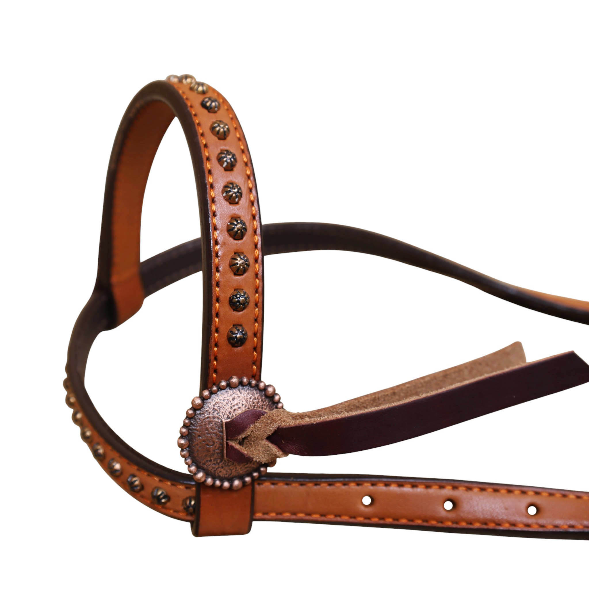 Headstall Type: Western Leather Headstall and Breast Collar tack Set decorated with Antic Nickel slot conchos with antique copper feather embossed leather with copper studs and copper slot conchos with latigo string