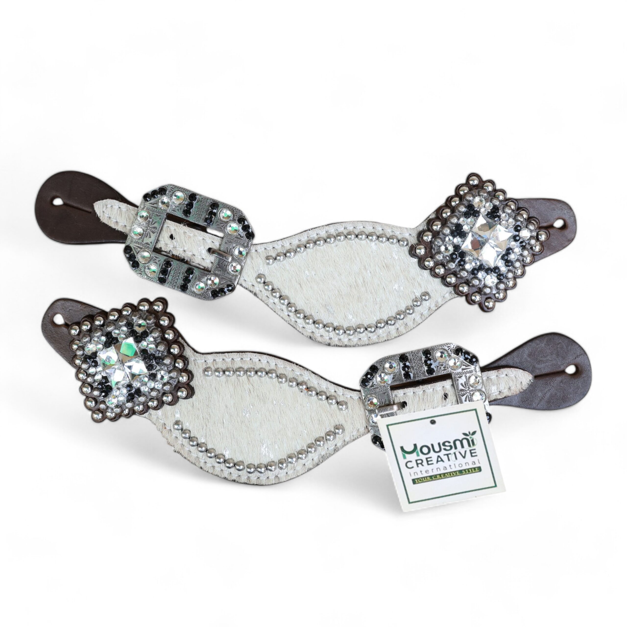 Western Horse Leather Headstall Complete Tack Set to Your Horse’s Gear Collection. Genuine Cowhide Acid Wash Hair on One Ear Headstall Matching Y Shape Breast Collar, Spur Strap, Wither Strap and Bronc Halter Decorated With Antique Nickel Conchos and Fittings. This Tack is Made From High Quality Argentina Cowhide, This Tack Set is not Even Comfortable But Stylish & Durable Also for Your Horse During Rides.