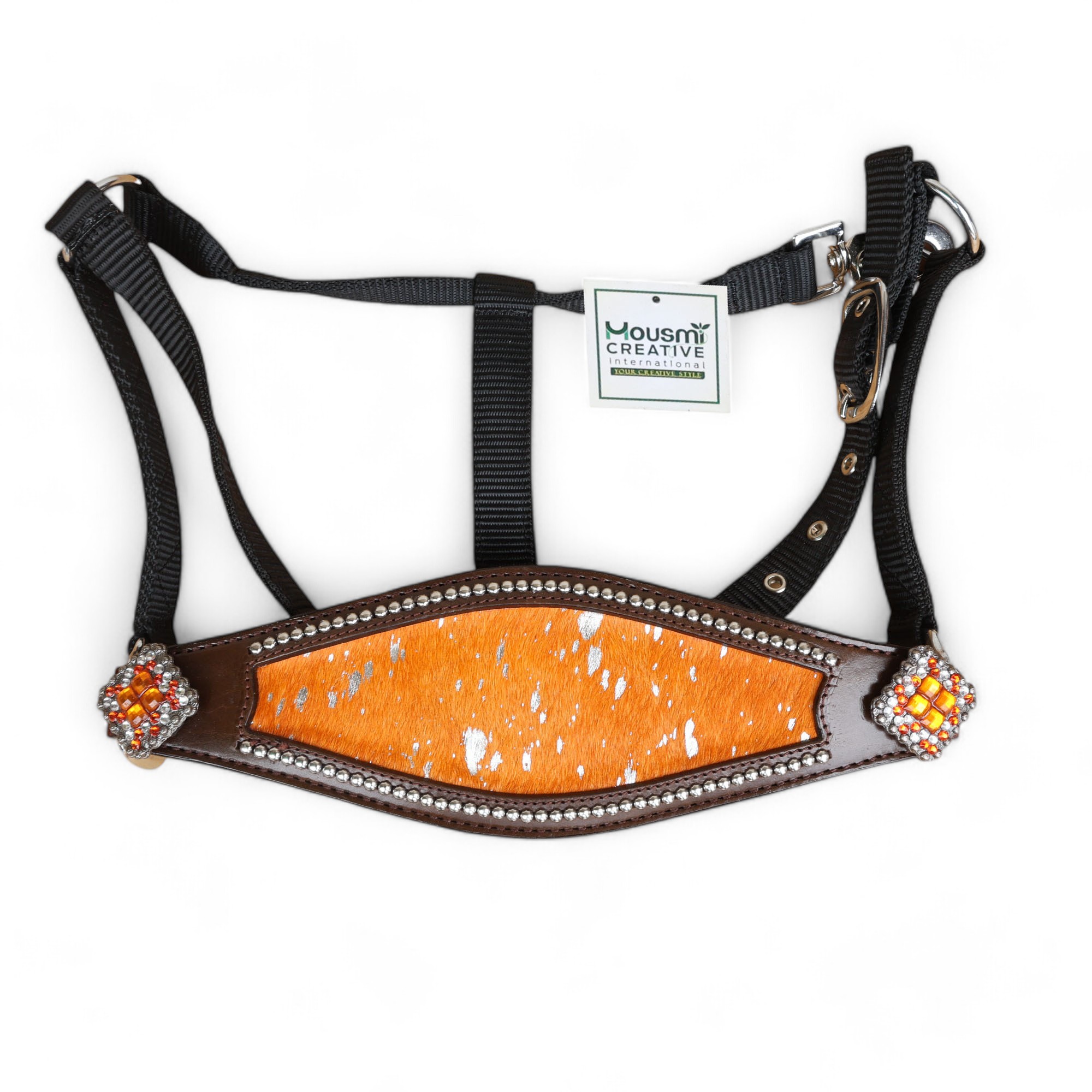 Western Horse Leather Headstall Complete Tack Set to Your Horse’s Gear Collection. Genuine Cowhide Acid Wash Hair on One Ear Headstall Matching Y Shape Breast Collar, Spur Strap, Wither Strap and Bronc Halter Decorated With Antique Nickel Conchos and Fittings. This Tack is Made From High Quality Argentina Cowhide, This Tack Set is not Even Comfortable But Stylish & Durable Also for Your Horse During Rides.