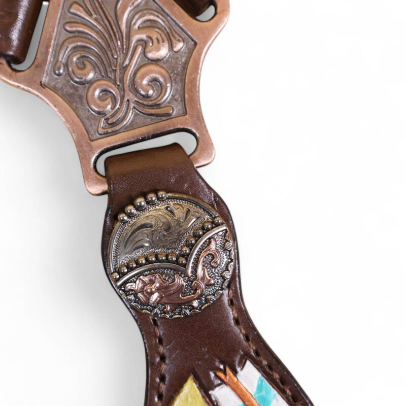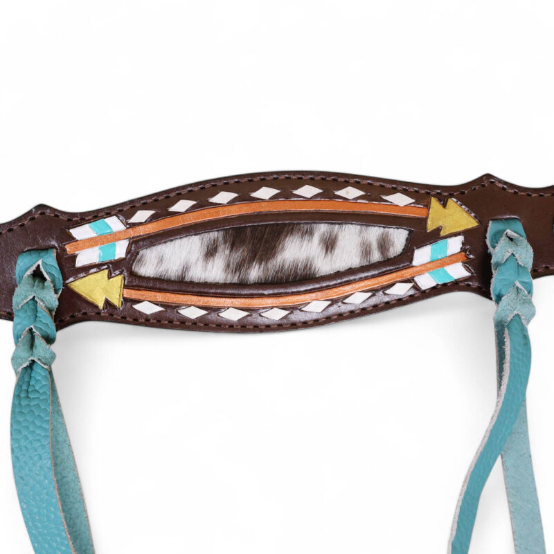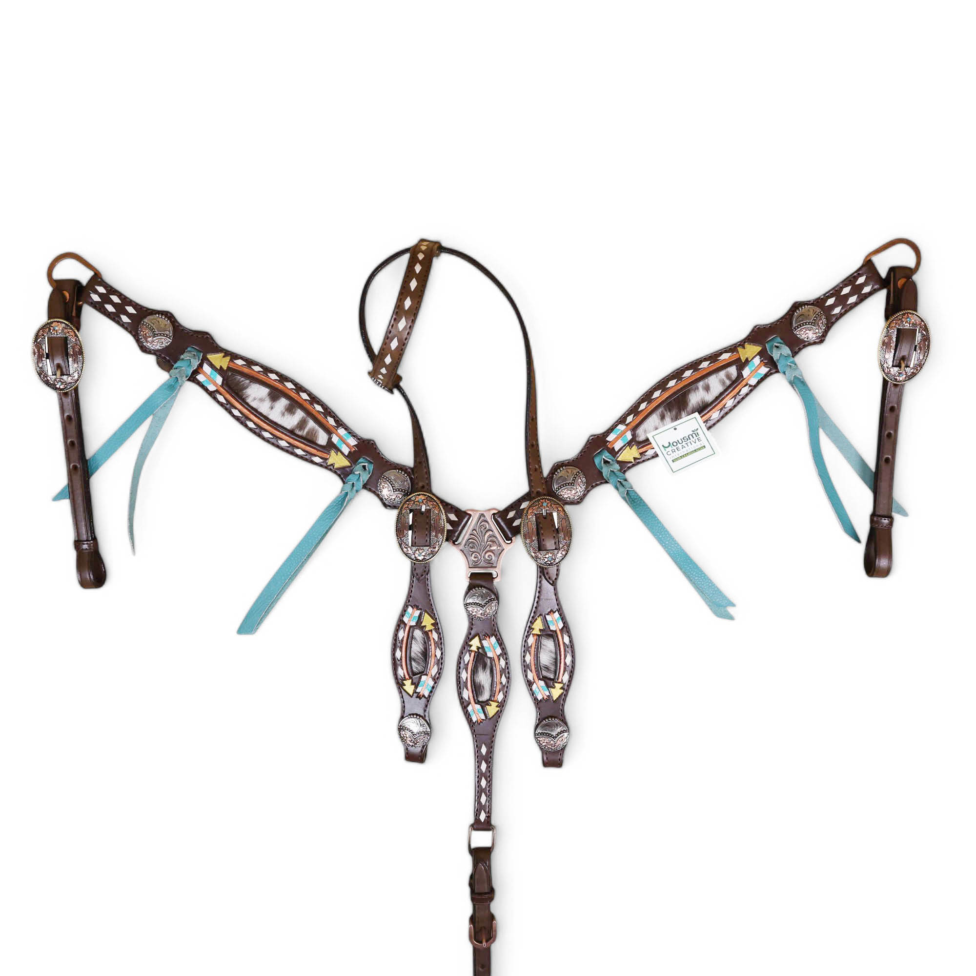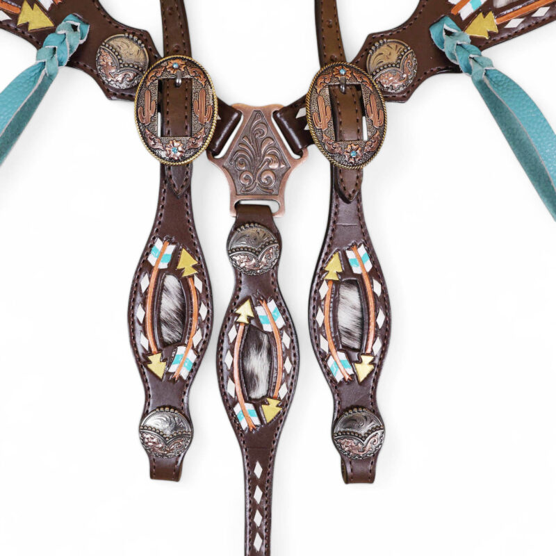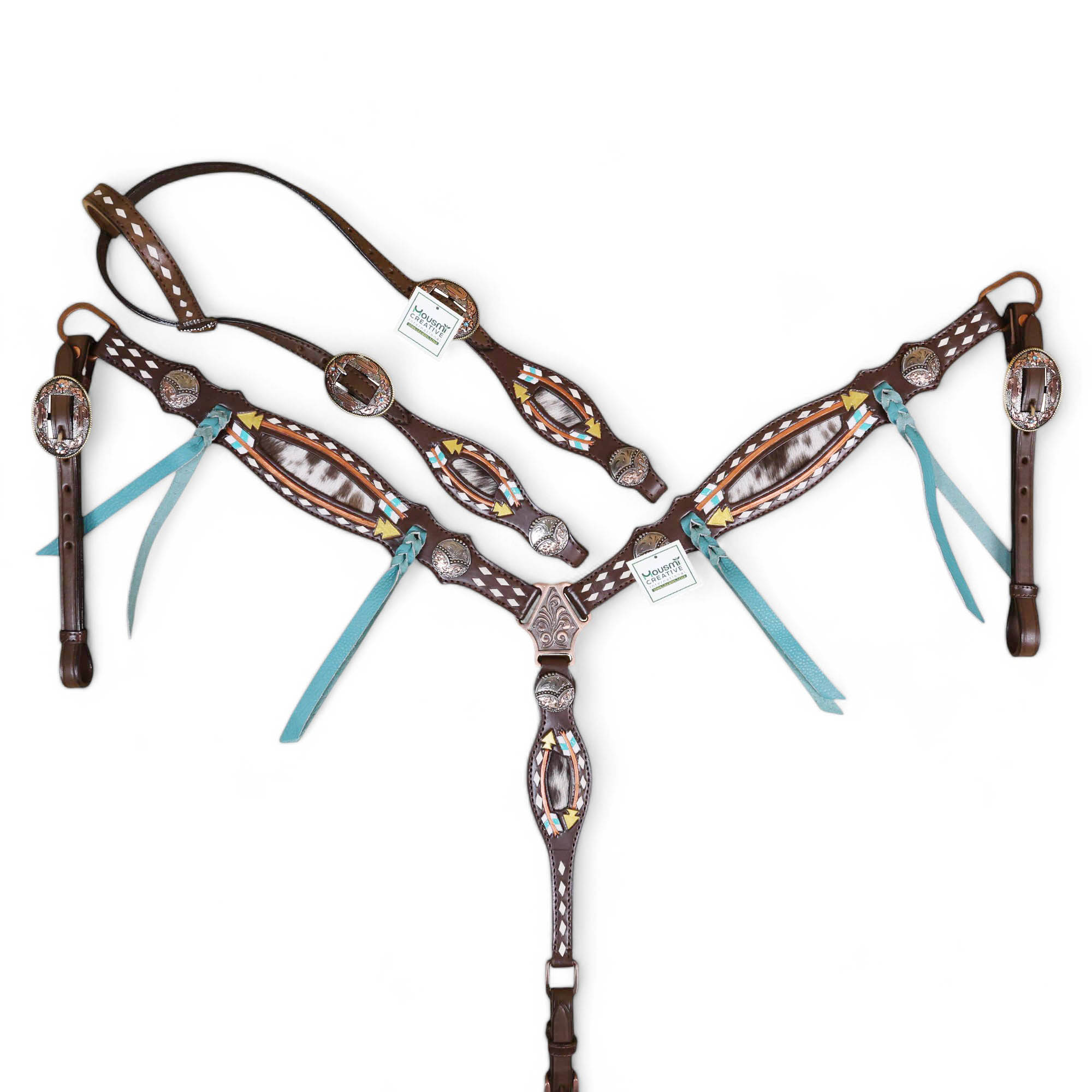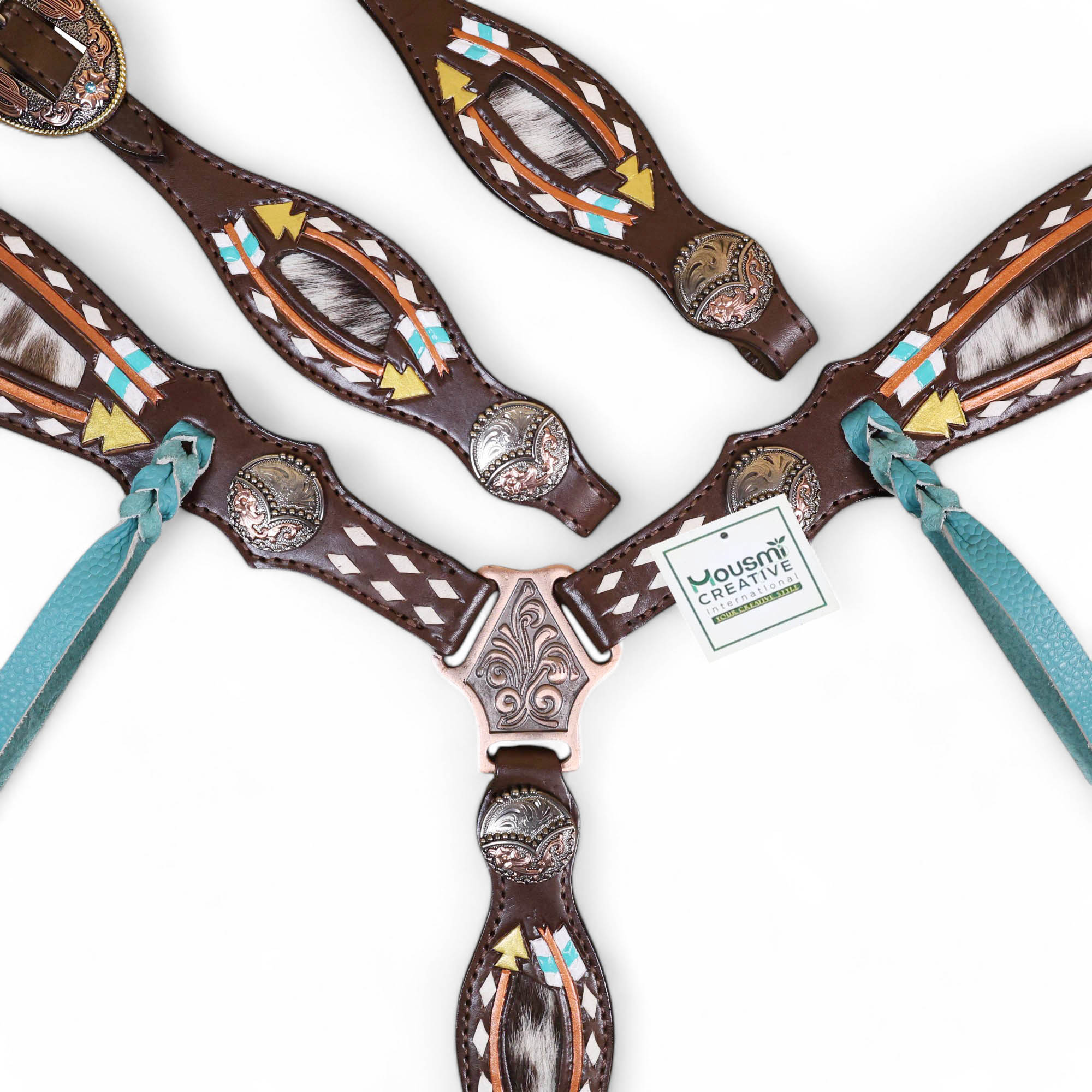 - Natural Cowhide Hair on Leather Patch Decorated Headstall matching Breast Collar Tack Set.