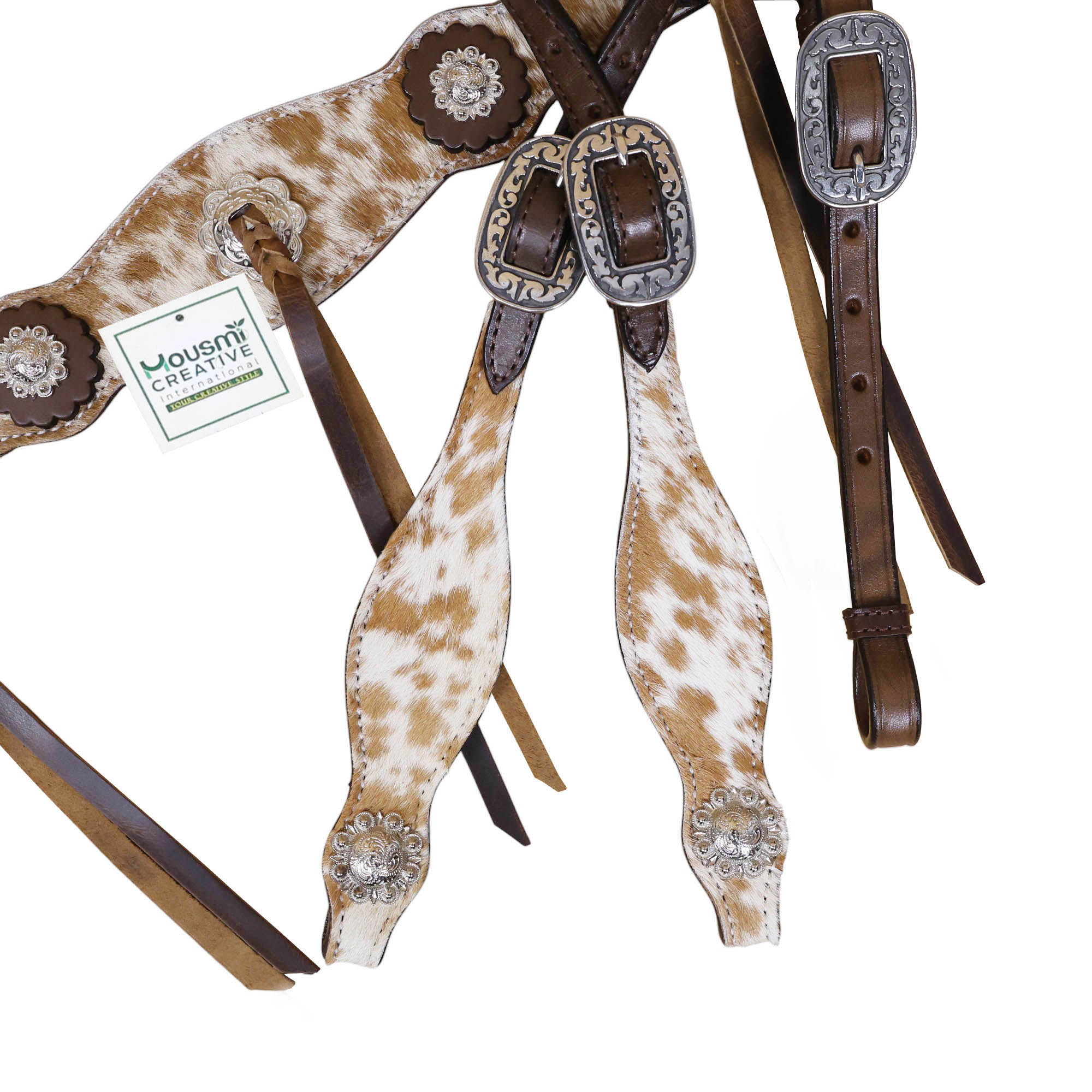 Western Horse Headstall Tack Set to Your Horse’s Gear Collection. Natural Cowhide Hair on Leather One Ear Headstall Matching Breast Collar Elegantly Decorated With Antique Nickel Conchos and Fittings. This Tack is Made From High Quality Argentina Cowhide Leather, This Tack Set is not Even Comfortable But Stylish & Durable Also for Your Horse During Rides.