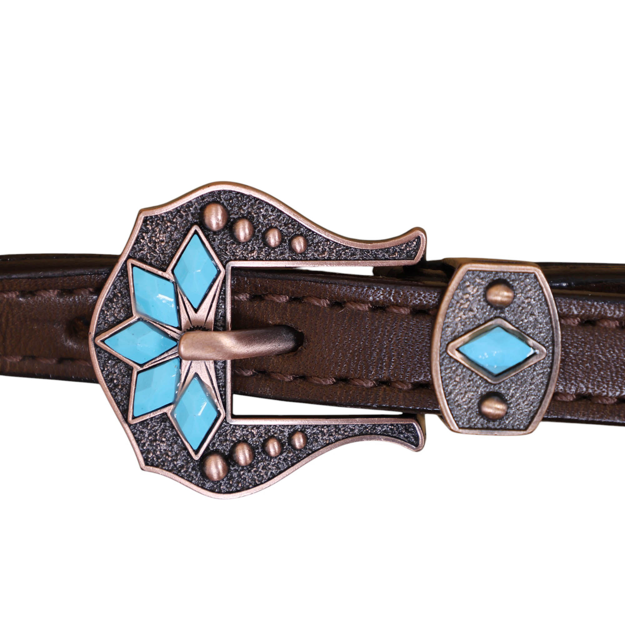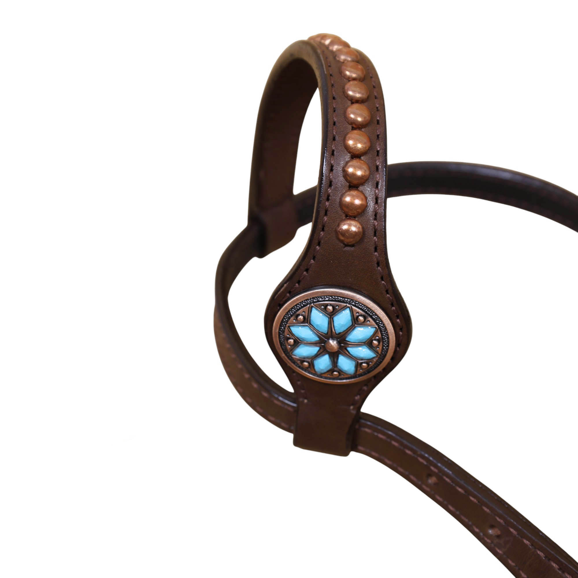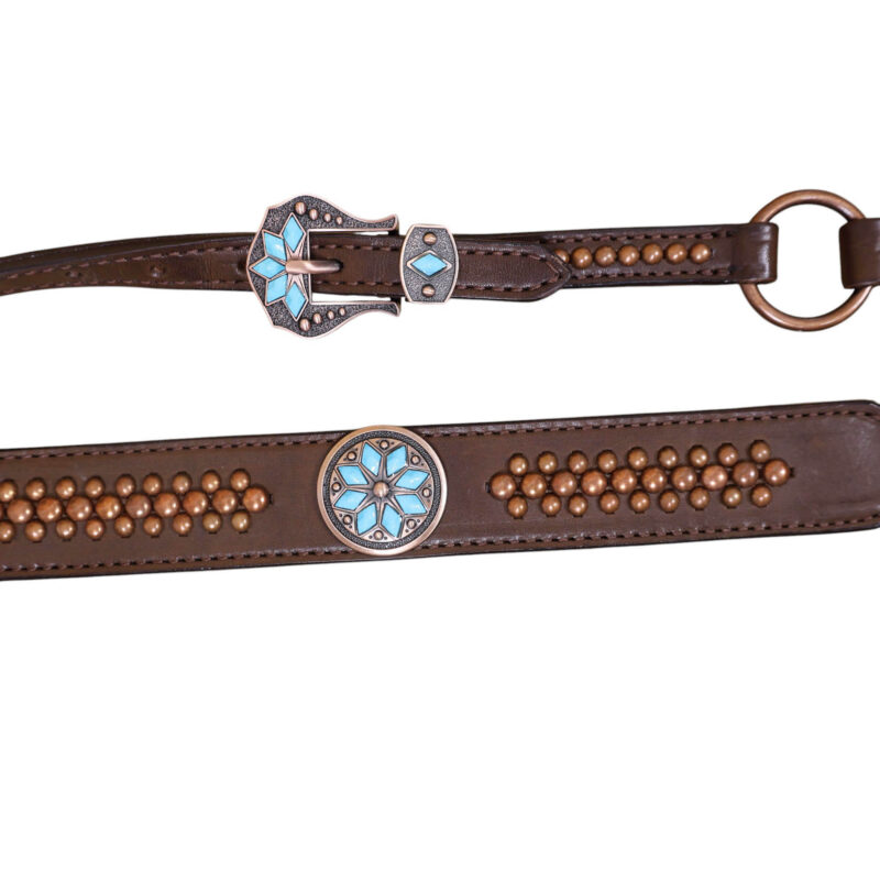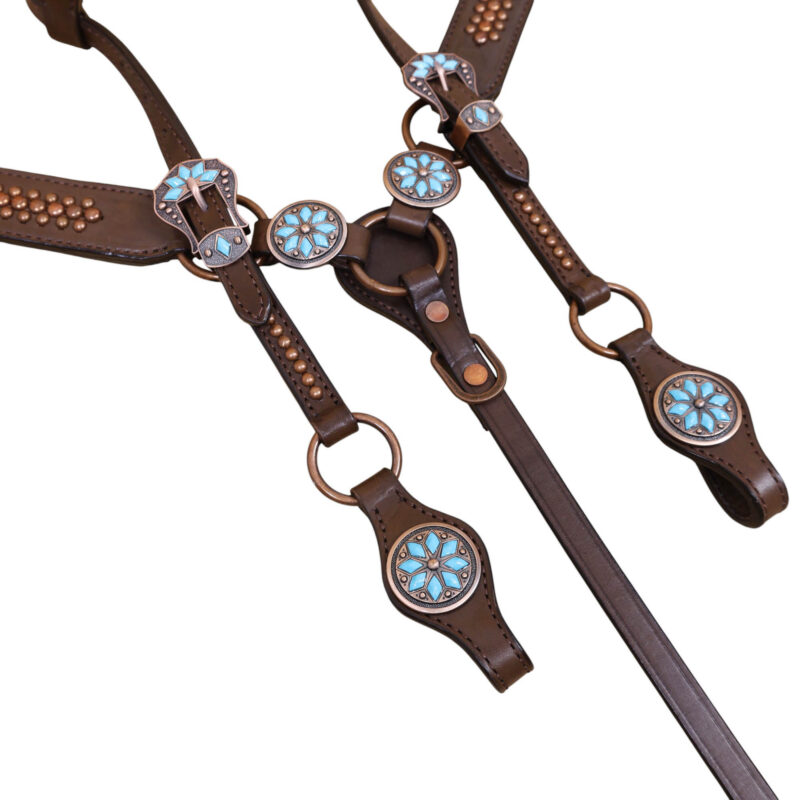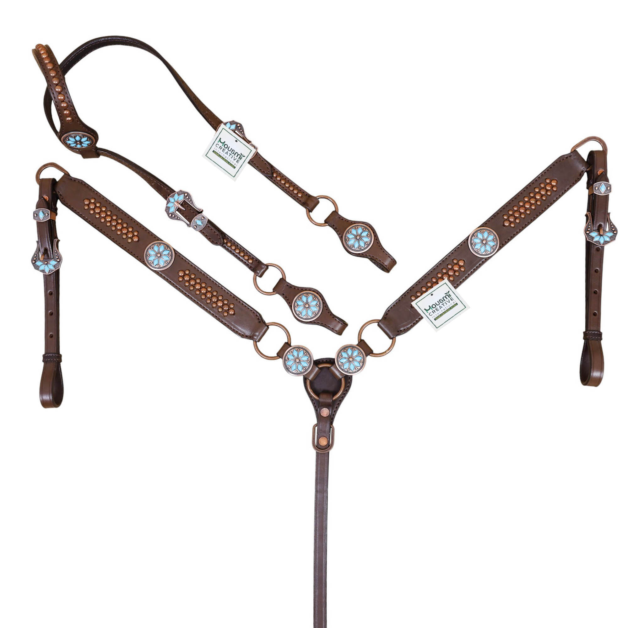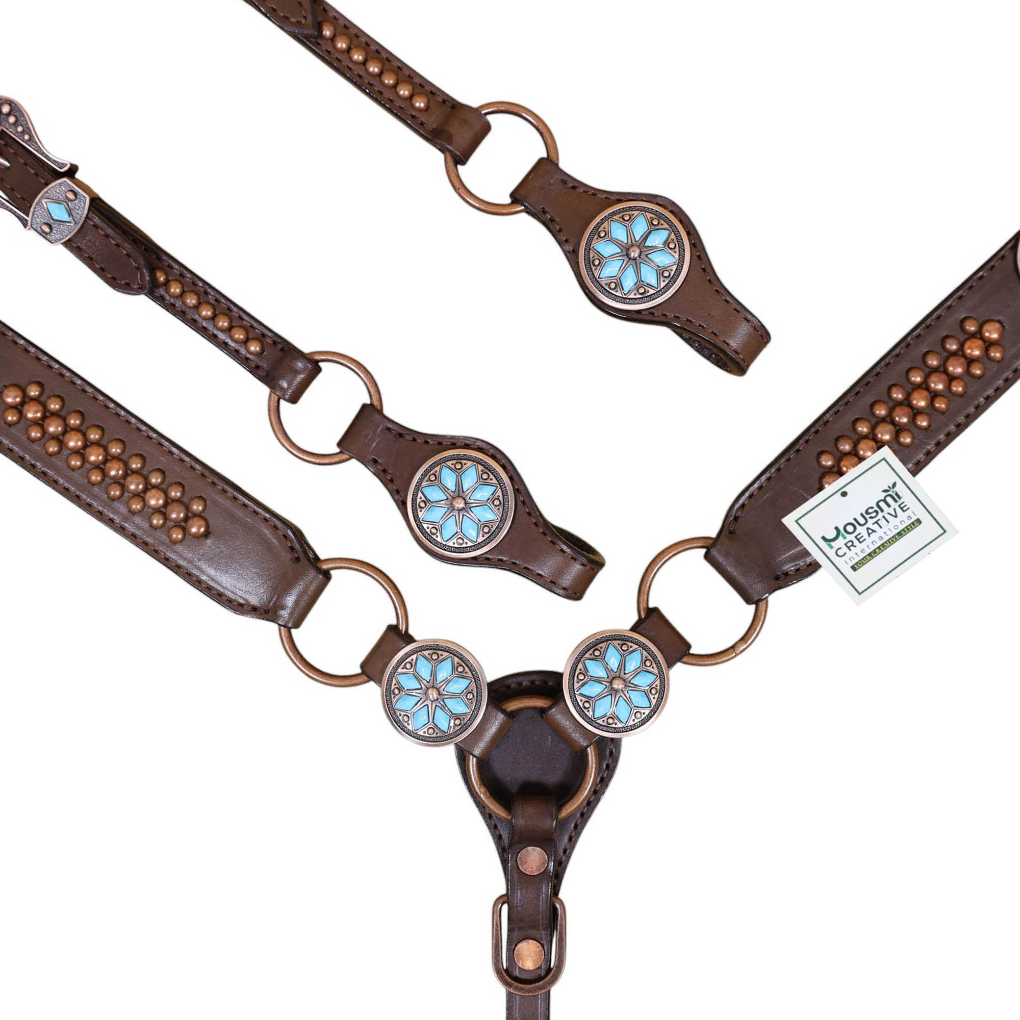 Western Horse Leather Headstall Tack Set to Your Horse’s Gear Collection. Copper Studs Studded Plain Leather Headstall and Breast Collar Decorated With Turquoise Flower Copper Conchos and Fittings. This Tack is Made From High Quality Argentina Cowhide, This Tack Set is not Even Comfortable But Stylish & Durable Also for Your Horse During Ride.