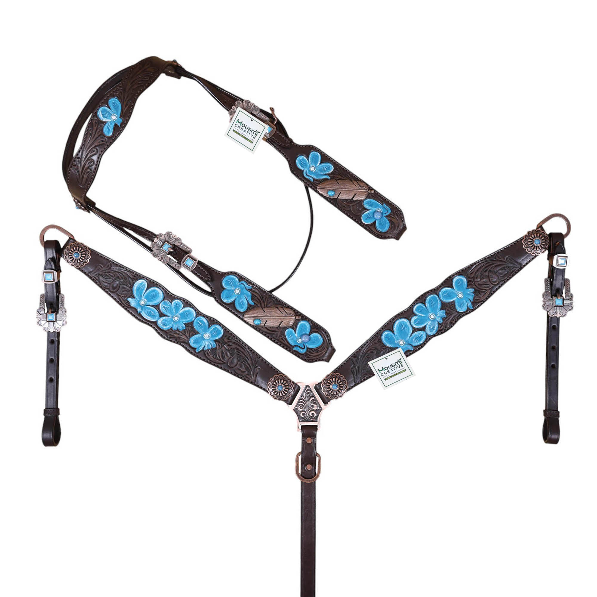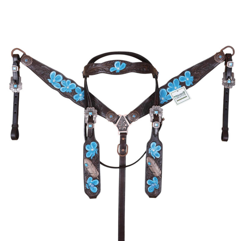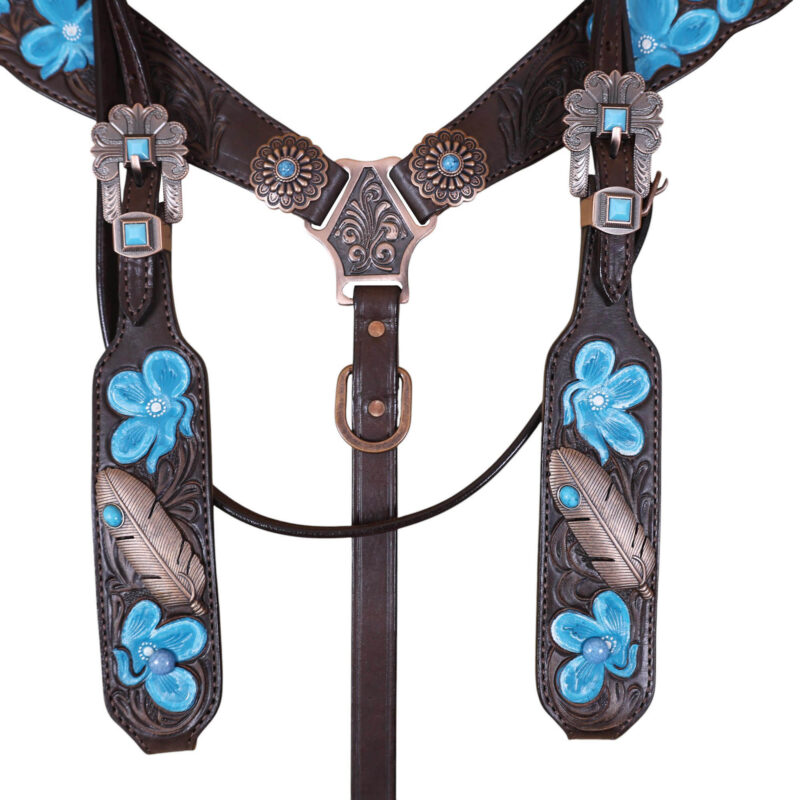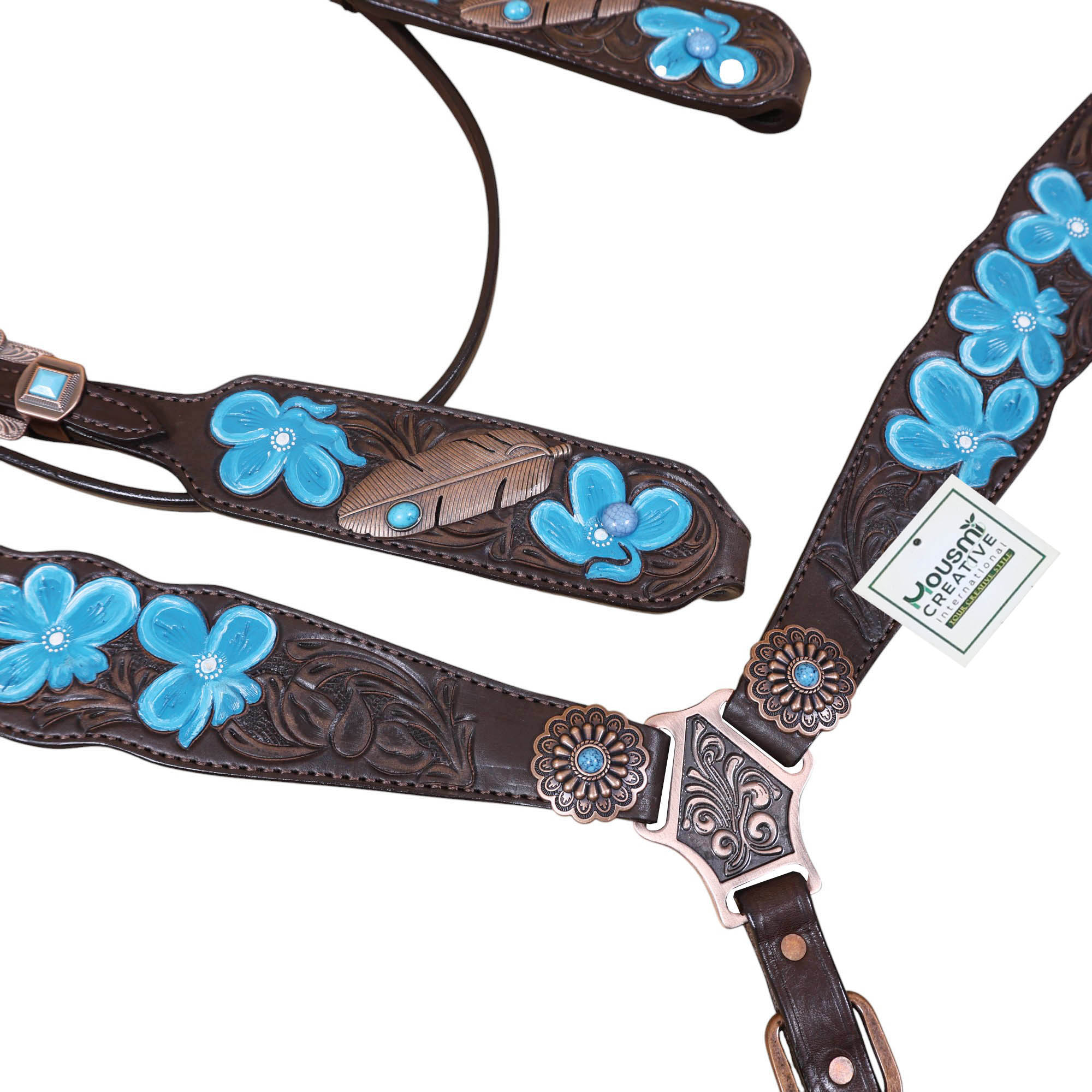 - Hand Tooled and Painted Turquoise Flower on Headstall and Breastplate.