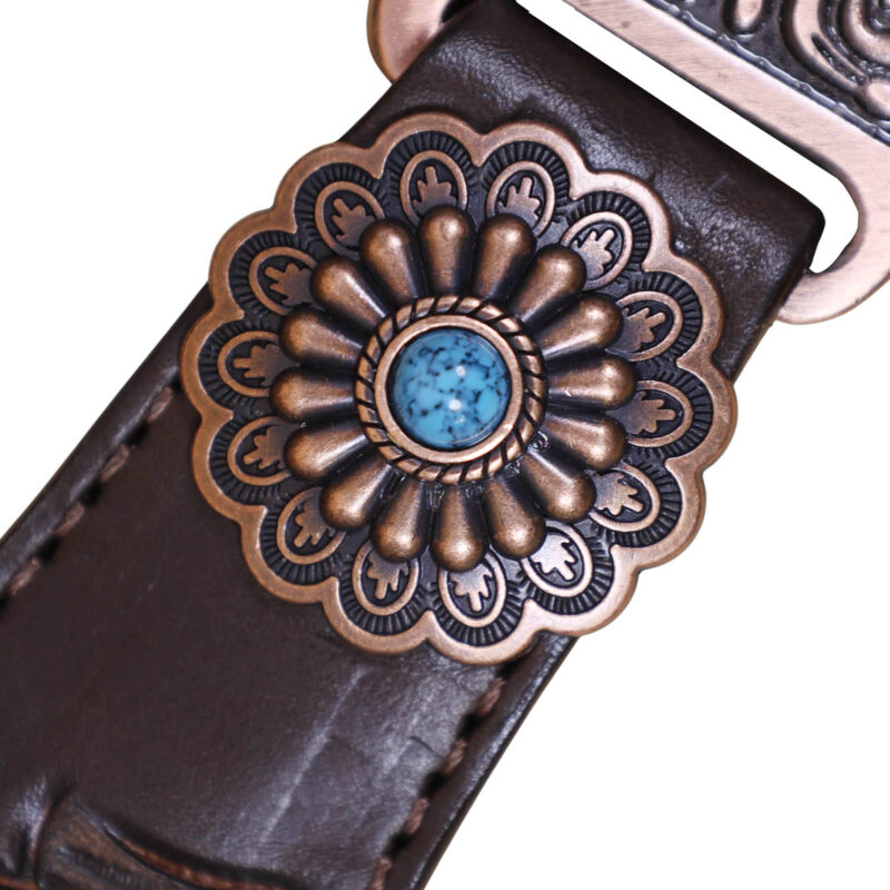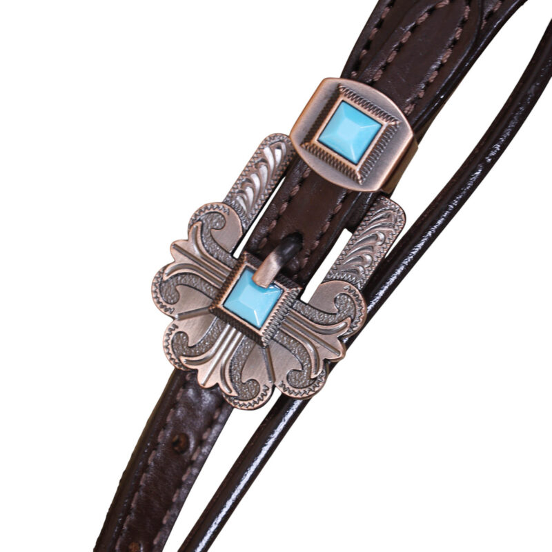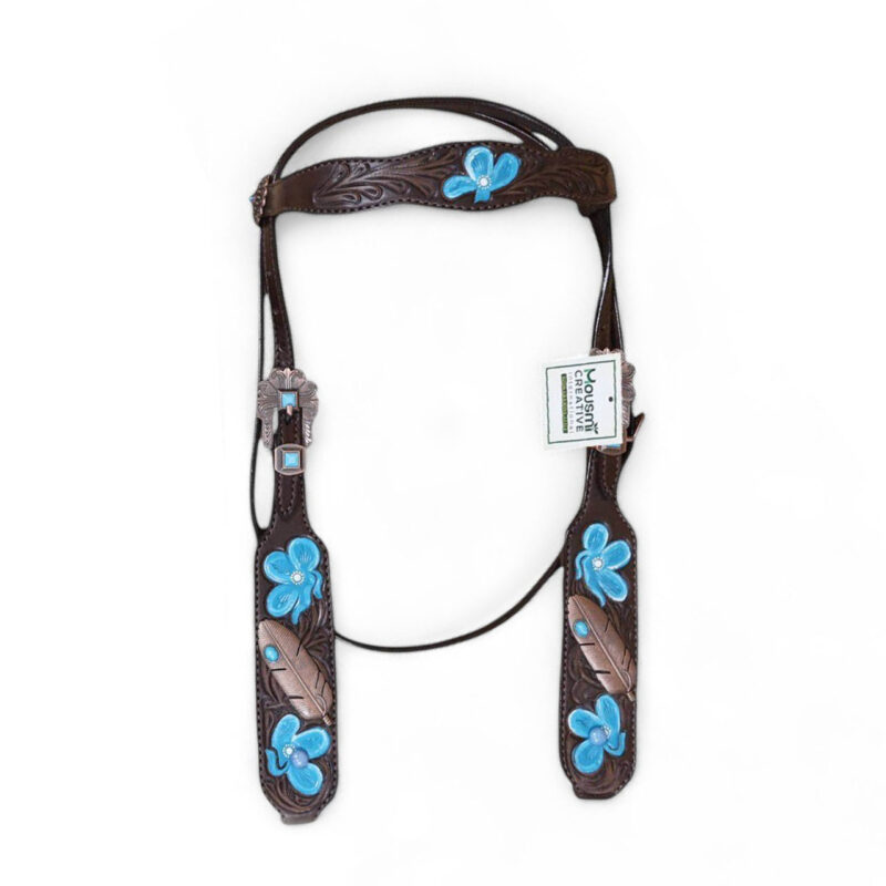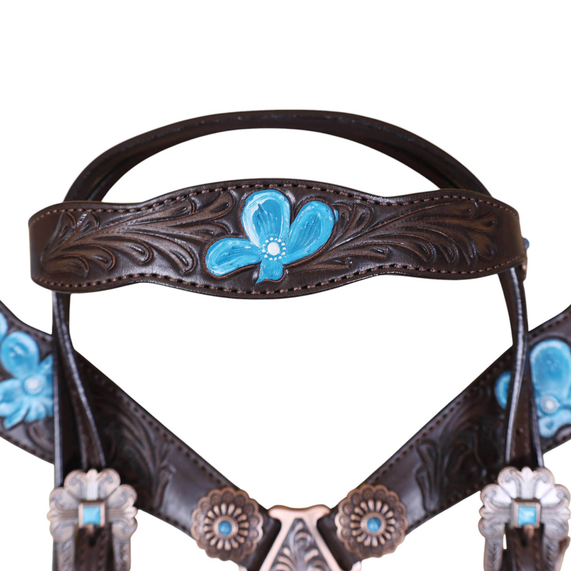 - Hand Tooled and Painted Turquoise Flower on Headstall and Breastplate.