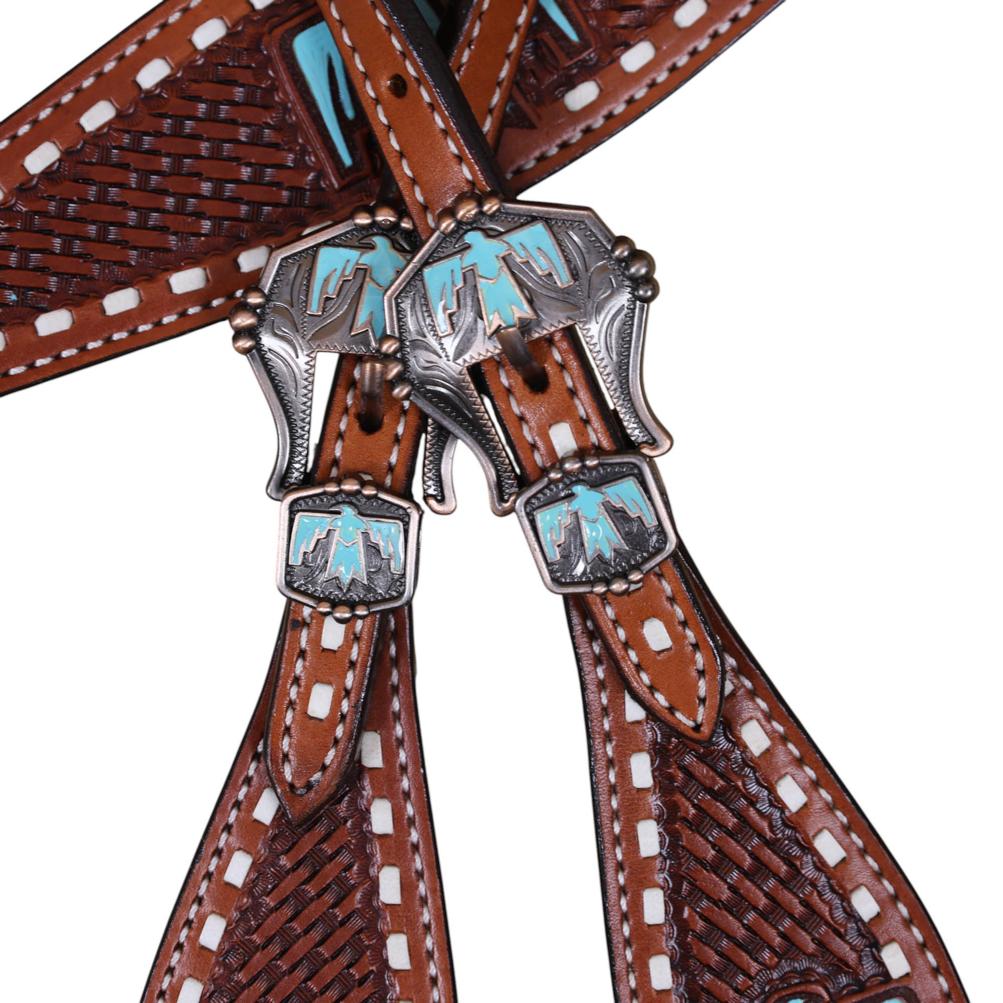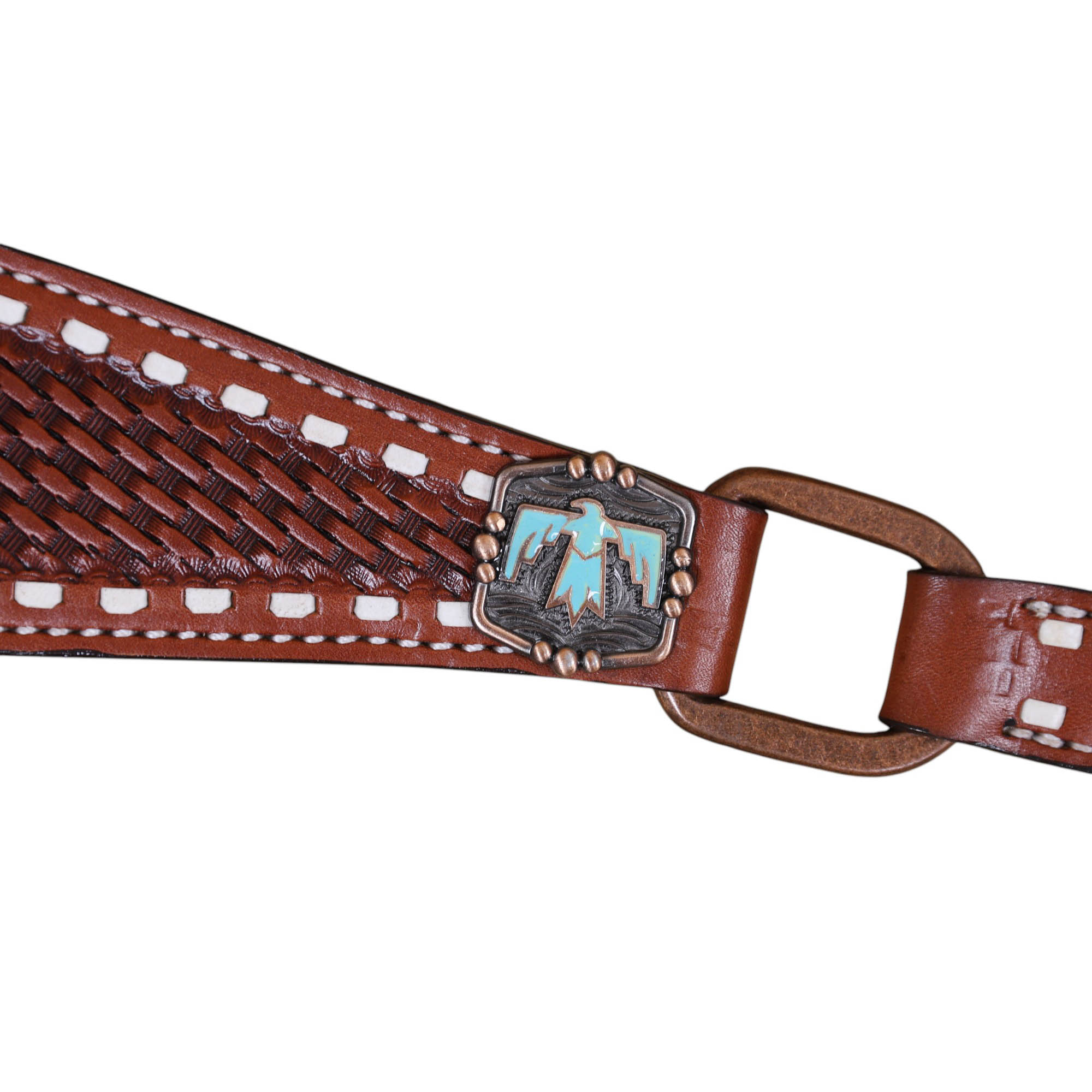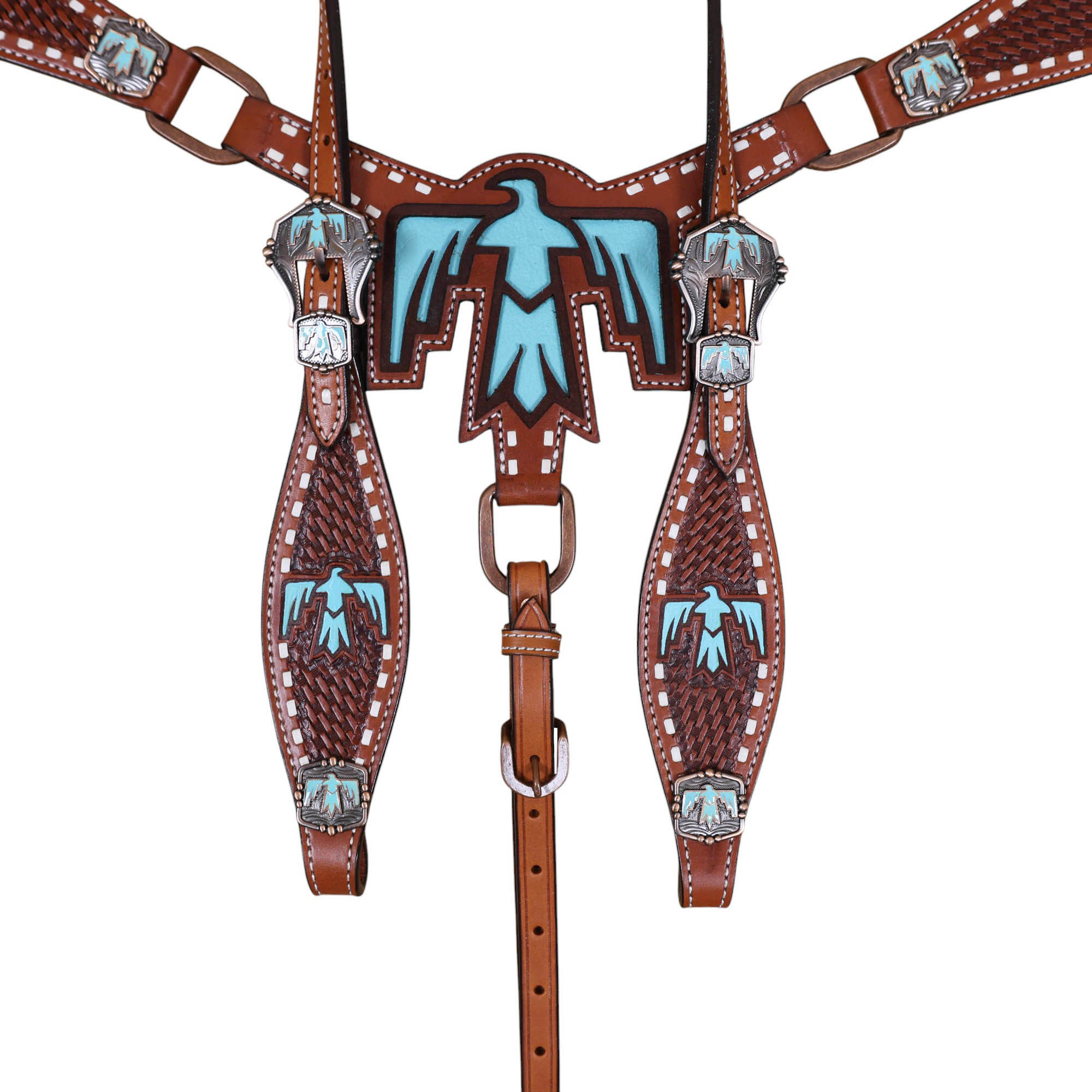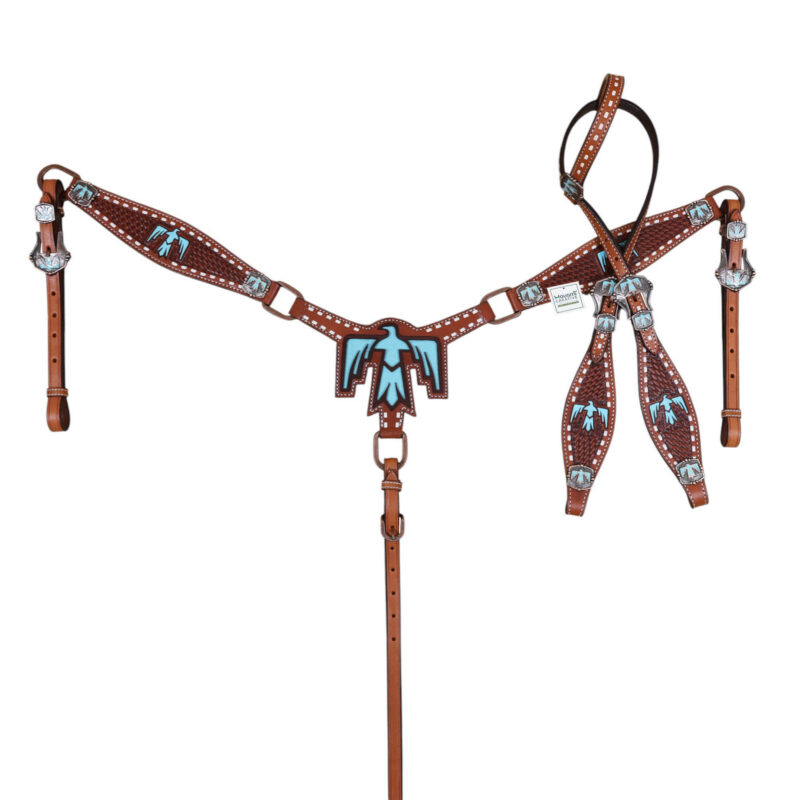 • Basketweave Tooling with Thunderbird Painted Cut-out on Headstall and Breastplate.