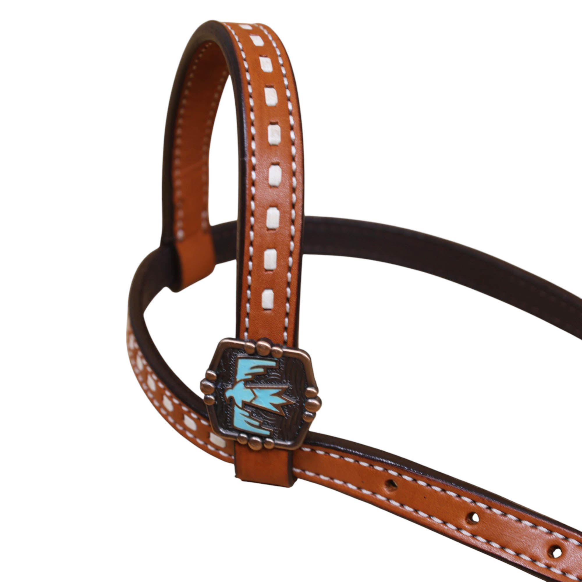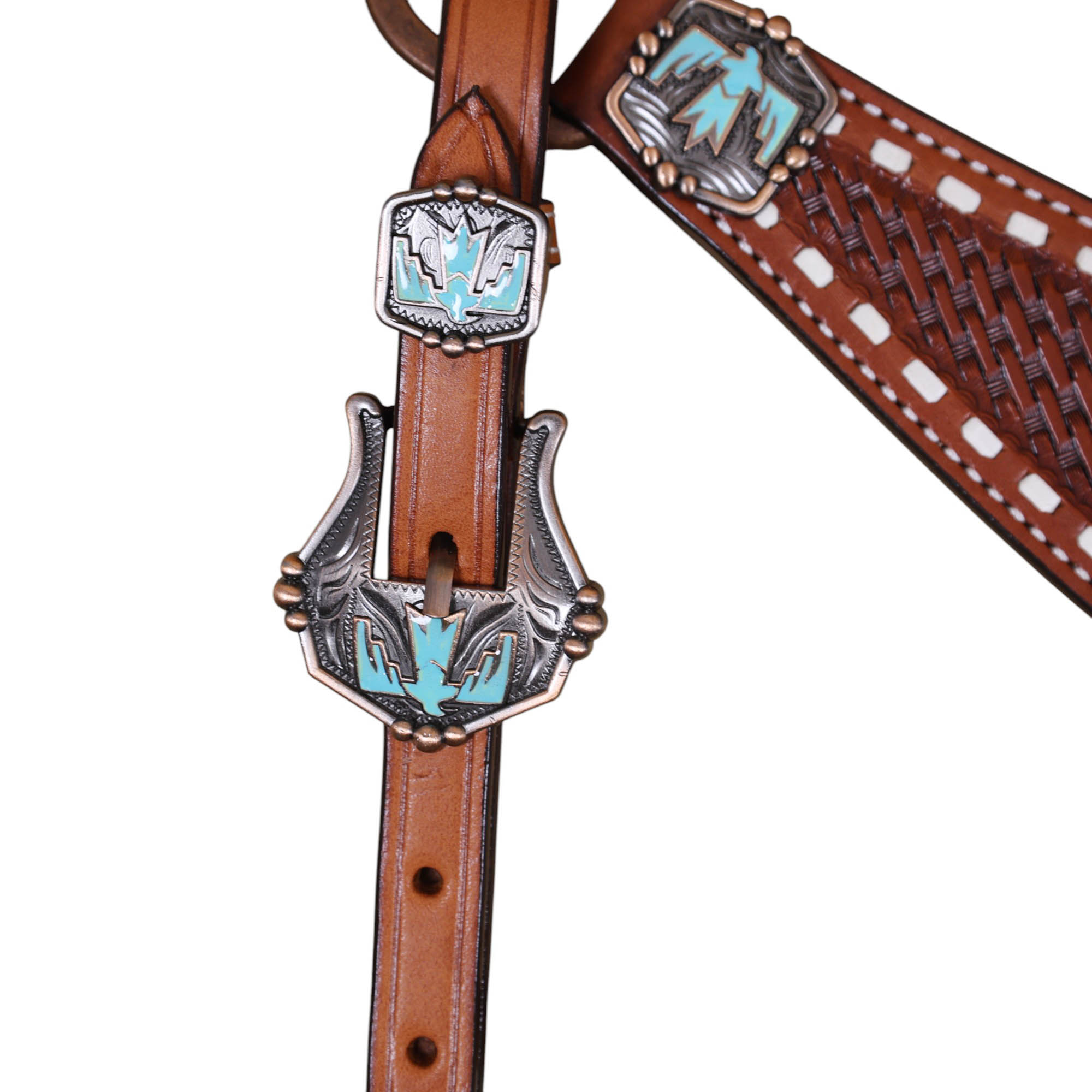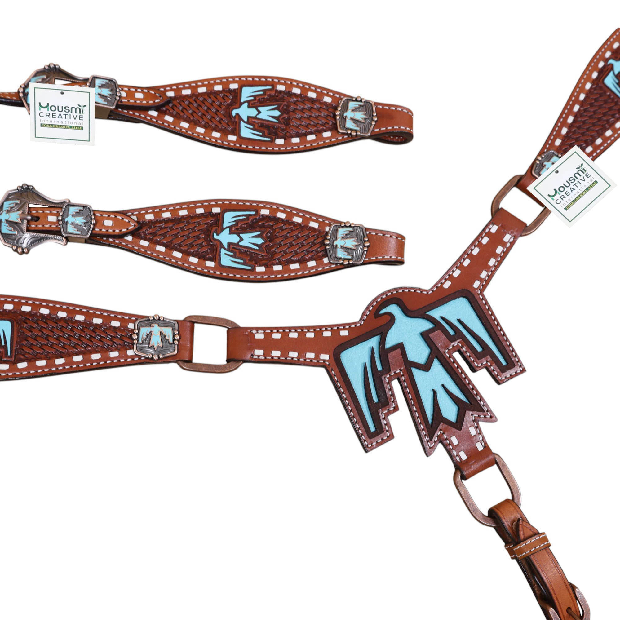 • Basketweave Tooling with Thunderbird Painted Cut-out on Headstall and Breastplate.