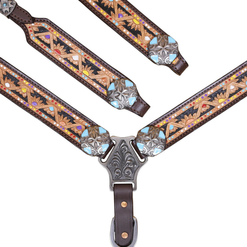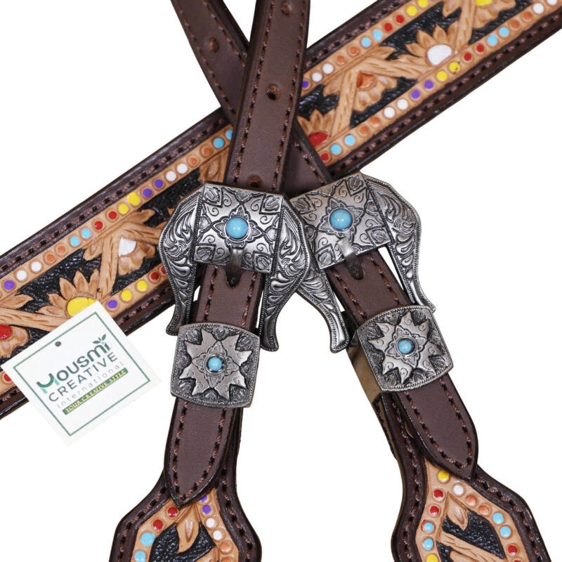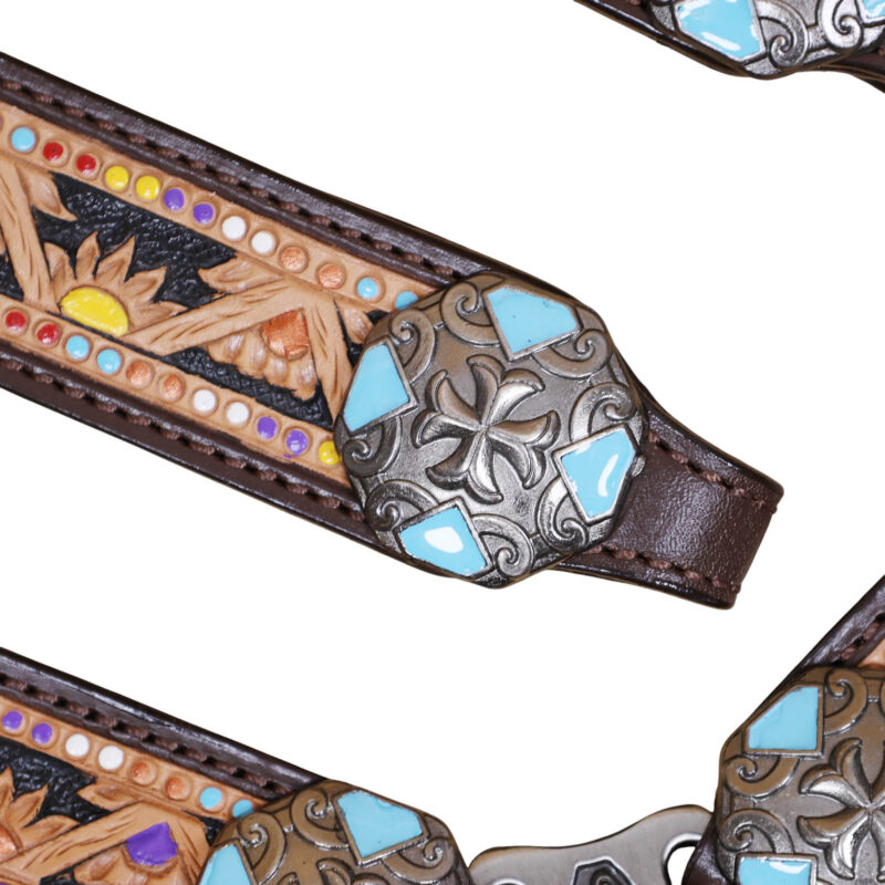 Headstall Type: Headstall and Breast Collar tack Set decorated with flower and geometrical carving and handpainting