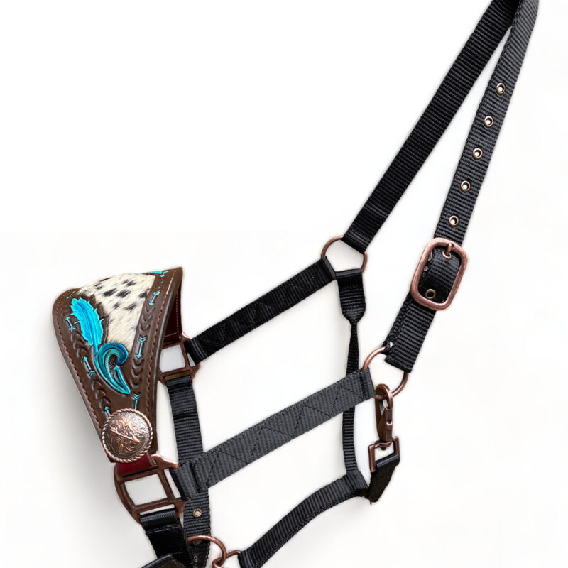 - Bronc Halter Decorated with cross error concho with turquois feather carving with cow hide