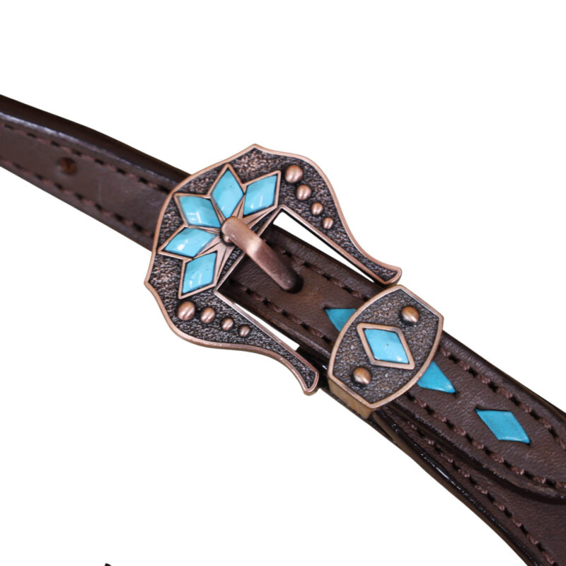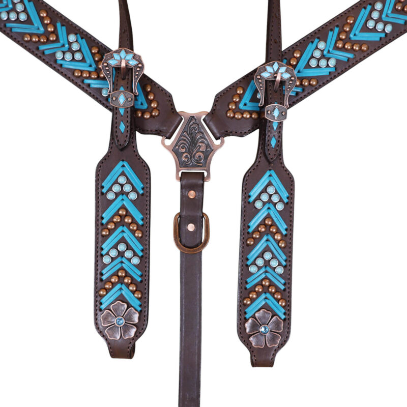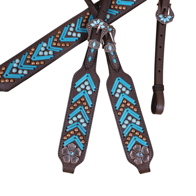 Headstall Type: Western Leather Headstall and Breast Collar tack Set decorated with turquoise arrow shape rawhide braiding,arrow shape copper and turquoise studs all over with flower conchos on check piece and one ear.