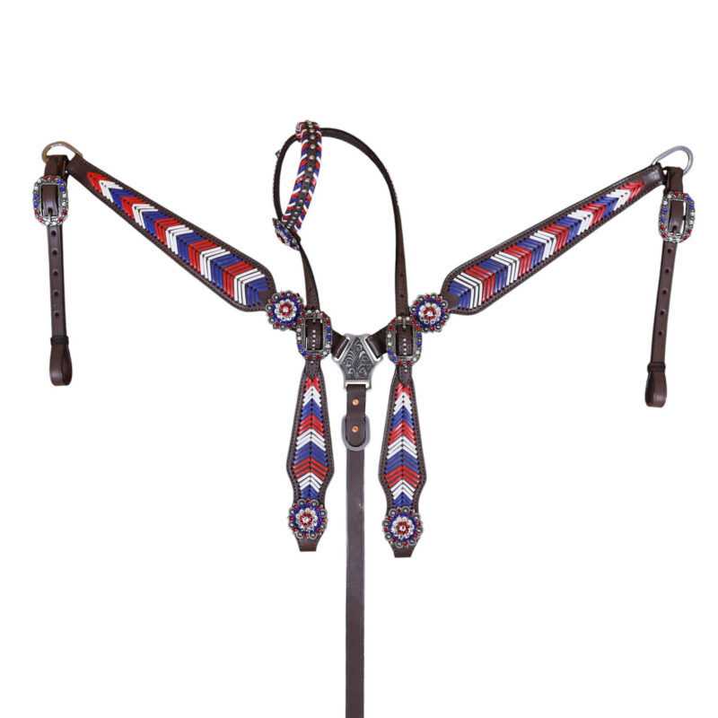 Headstall Type: Western Leather Headstall and Breast Collar tack Set decorated with American Flag tree colour rawhide braiding in Arrow shape all over breast collar and check pieces