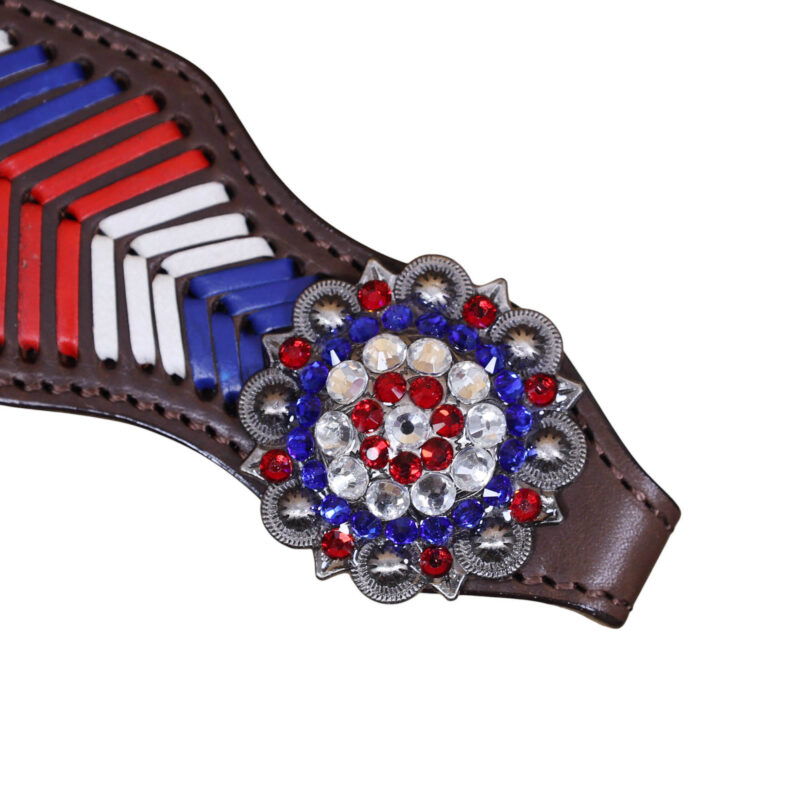 Bulk production Handmade Headstall and Breast Collar tack Set decorated with American Flag tree colour rawhide braiding in Arrow shape all over breast collar and check pieces. Only Premium American Flag Rhinestone, Berry Concho, and Buckles