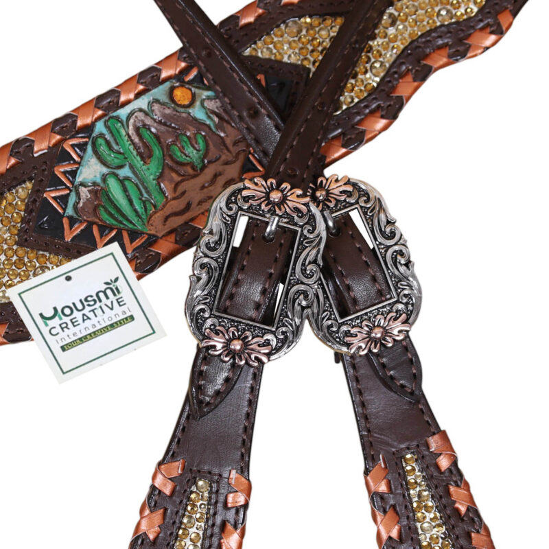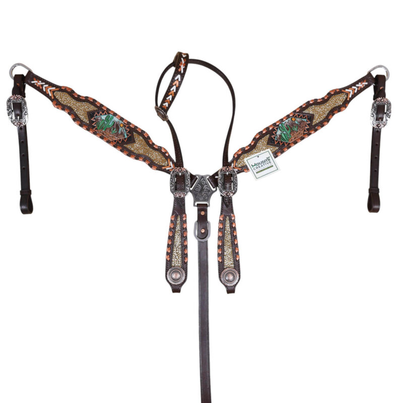 Add This Western Horse Leather Headstall Tack Set to Your Horse’s Gear Collection. Genuine Cowhide One Ear Headstall and Y Shape Breast Collar Decorated with Hand Tooled and Painted Cactus and Mountain.  This Leather Tack Set Features Rawhide Leather Criss Cross Braided and Topaz Stones on Breast Collar and Cheek Pieces. This Tack is Made From High Quality Argentina Cowhide, This Tack Set is not Even Comfortable But Stylish & Durable Also for Your Horse During Ride.